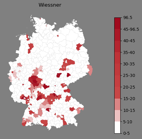 Relative Verteilung des Namens Wiessner (1996)Direkt zur Karte Die Farbskala zeigt die Anzahl von "Wiessner" bezogen auf je 1 Million Einträge. |
