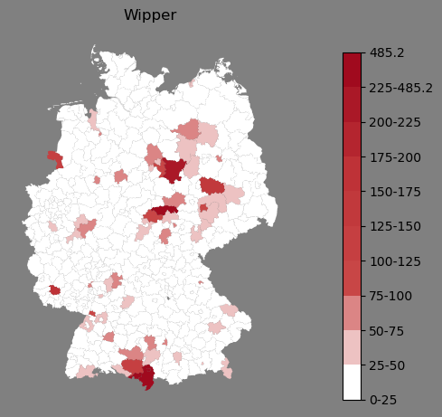 Relative Verteilung des Namens Wipper (1996)Direkt zur Karte Die Farbskala zeigt die Anzahl von "Wipper" bezogen auf je 1 Million Einträge. |