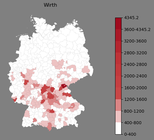 Absolute Verteilung des Namens Wirth (1890)Direkt zur Karte Absolute Verteilung des Namens "Wirth" um 1890 im damaligen Deutschen Reich Sie können die Karte innerhalb des Fensters zoomen und verschieben. |