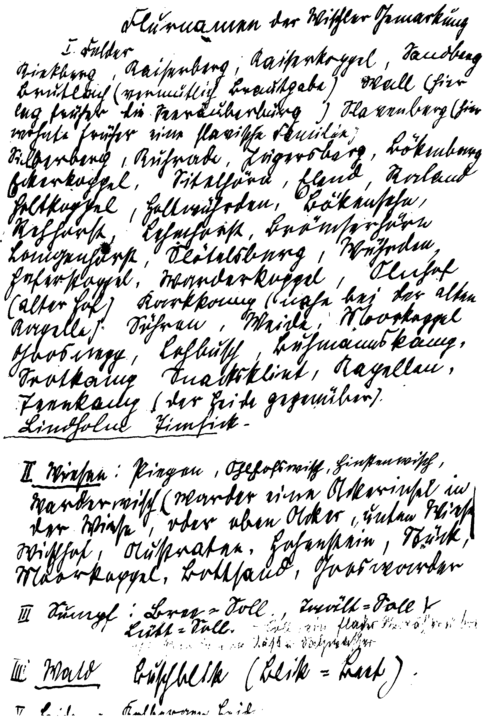 Ki...berg , Kaiserberg, Kaiserkoggel, Sandberg Brutloich (vermutlich Brautgabe) Wall (hier lag früher die S....berg) Slavenberg (hier .... früher eine slavische .... Silberberg, Kiesrade, ....berg, Bökenberg ... ... ... ... ... (alter Hof) ... (... bei der alten Kapelle) ..., ..., Moor... ... ... ... (der ... gegenüber). ...
