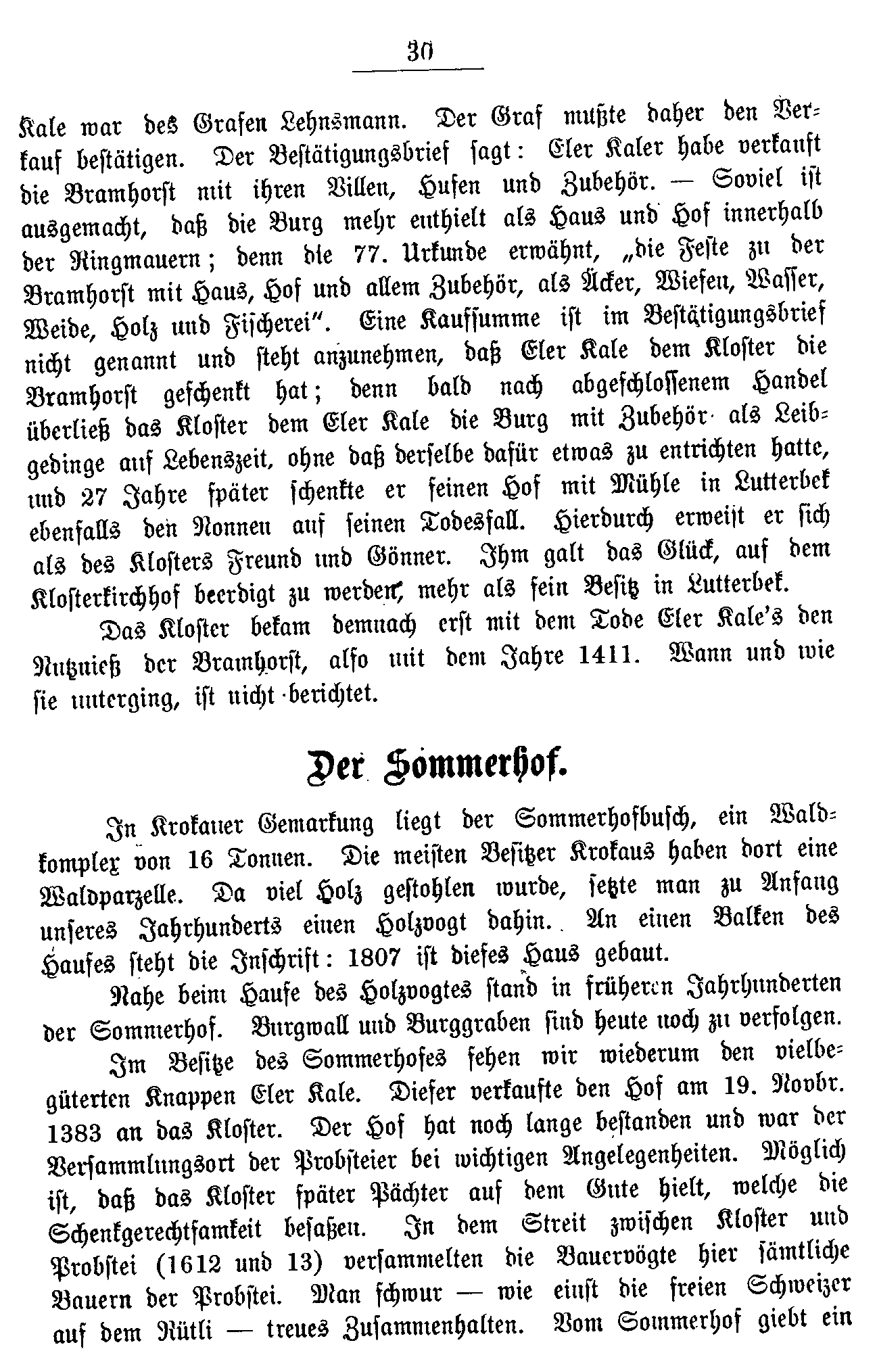 Im Besitze des Sommerhofes sehen wir wiederum den vielbegüterten Knappen Eler Kale. Dieser verkaufte den Hof am 19. Novbr. 1383 an das Kloster. Der Hof hat noch lange bestanden und war der Versammlungsort der Probsteier bei wichtigen Angelegenheiten. Möglich ist, daß das Kloster später Pächter auf dem Gute hielt, welche die Schenkgerechtsamkeit besaßen. In dem Streit zwischen Kloster und Probstei (1612 und 13) versammelten die Bauervögte hier sämtliche Bauern der Probstei. Man schwur - wie einst die freien Schweizer auf dem Rütli - treues Zusammenhalten. Vom Sommerhof giebt