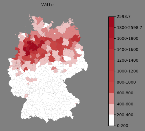 Der Name Witte ist deutschlandweit verbreitet. Die Karte zeigt eine Namenskonzentration im Landkreis Osnabrück, in der Region Hannover und in Berlin. Im Landkreis Osnabrück findet sich ein auf das Frühmittelalter zurückgehender Hof, deren Vollerbe ein "de Witte", später Witte: