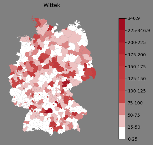 Relative Verteilung des Namens Wittek (1996)Direkt zur Karte Die Farbskala zeigt die Anzahl von "Wittek" bezogen auf je 1 Million Einträge. |