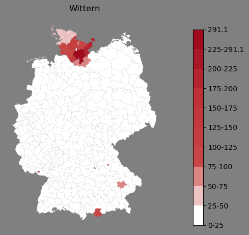 Relative Verteilung des Namens Wittern (1996)Direkt zur Karte Die Farbskala zeigt die Anzahl von "Wittern" bezogen auf je 1 Million Einträge. |