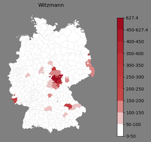 Relative Verteilung des Namens Witzmann (1996)Direkt zur Karte Die Farbskala zeigt die Anzahl von "Witzmann" bezogen auf je 1 Million Einträge. |