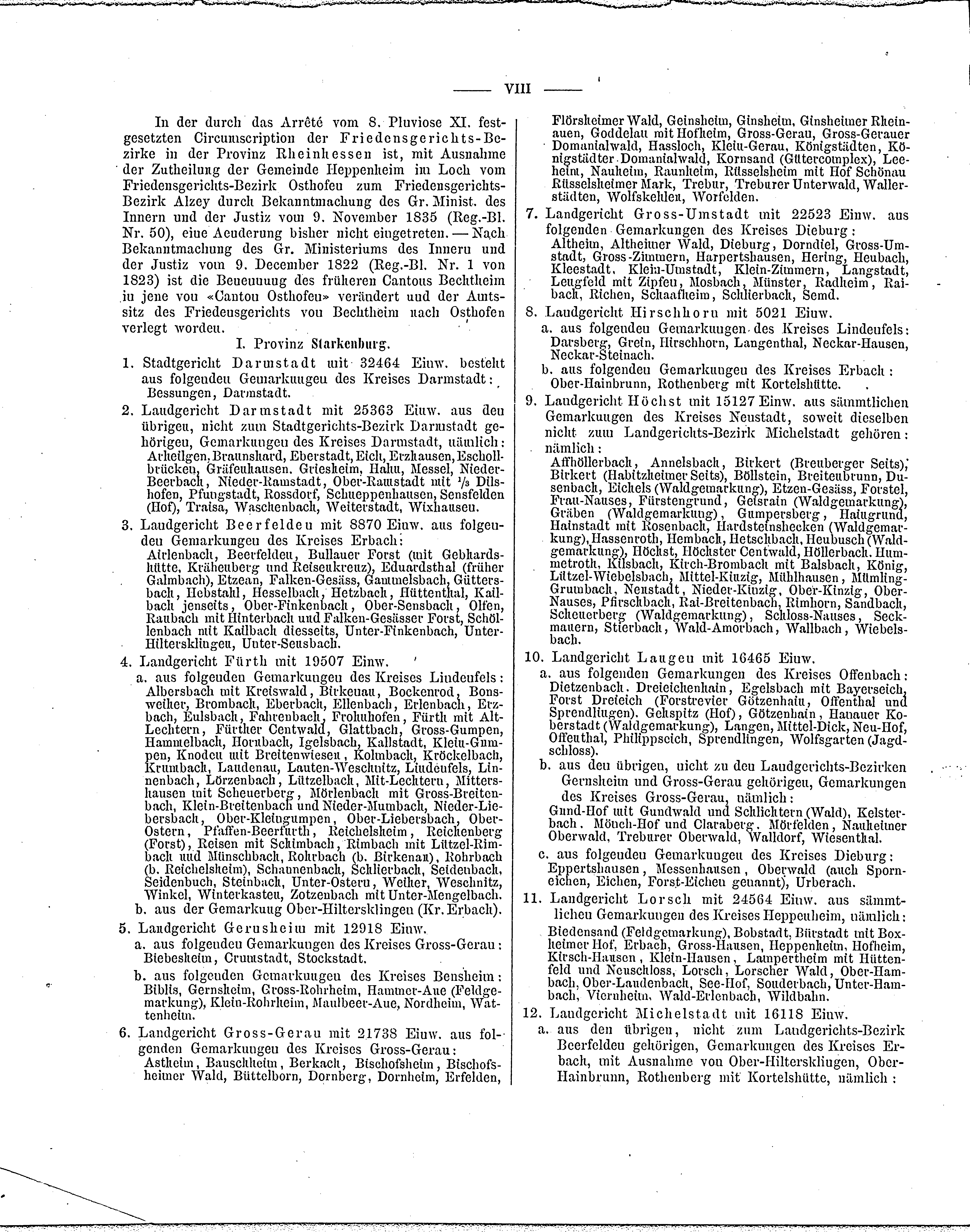 In der durch das Arrêté vom 8. Pluviose XI. festgesetzten Circumscription der Friedensgerichts-Bezirke in der Provinz Rheinhessen ist, mit Ausnahme der Zutheilung der Gemeinde Heppenheim im Loch vom Friedensgerichts-Bezirk Osthofen zum Friedensgerichts-Bezirk Alzey durch Bekanntmachung des Gr. Minist. des Innern und der Justiz vom 9. November 1835 (Reg.-Bl. Nr. 50), eine Aenderung bisher nicht eingetreten. — Nach Bekanntmachung des Gr. Ministeriums des Innern und der Justiz vom 9. December 1822 (Reg.-Bl. Nr. 1 von 1823) ist die Benennung des früheren Cantons Bechtheim in jene von «Canton Osthofen» verändert und der Amtssitz des Friedensgerichts vou Bechtheim nach Osthofen verlegt worden.
