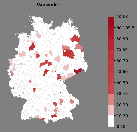 Relative Verteilung des Namens Woiwode (1996)Direkt zur Karte Die Farbskala zeigt die Anzahl von "Woiwode" bezogen auf je 1 Million Einträge. |