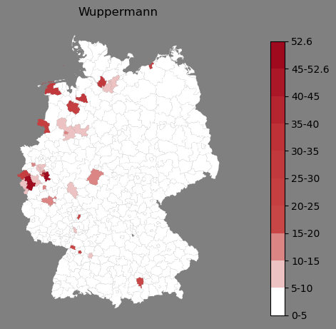 Relative Verteilung des Namens Wuppermann (1996)Direkt zur Karte Die Farbskala zeigt die Anzahl von "Wuppermann" bezogen auf je 1 Million Einträge. |
