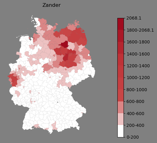 Relative Verteilung des Namens Zander (1996)Direkt zur Karte Die Farbskala zeigt die Anzahl von "Zander" bezogen auf je 1 Million Einträge. |
