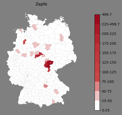 Relative Verteilung des Namens Zapfe (1996)Direkt zur Karte Die Farbskala zeigt die Anzahl von "Zapfe" bezogen auf je 1 Million Einträge. |