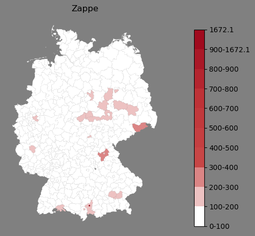 Relative Verteilung des Namens Zappe (1996)Direkt zur Karte Die Farbskala zeigt die Anzahl von "Zappe" bezogen auf je 1 Million Einträge. |