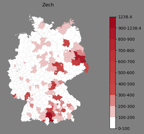 Absolute Verteilung des Namens Zech (1890)Direkt zur Karte Absolute Verteilung des Namens "Zech" um 1890 im damaligen Deutschen Reich Sie können die Karte innerhalb des Fensters zoomen und verschieben. |
