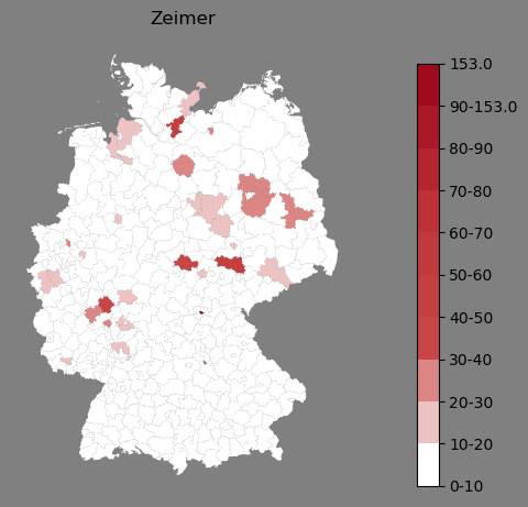Relative Verteilung des Namens Zeimer (1996)Direkt zur Karte Die Farbskala zeigt die Anzahl von "Zeimer" bezogen auf je 1 Million Einträge. |