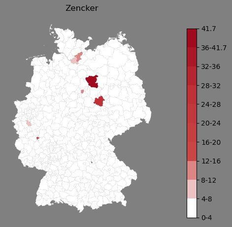 Relative Verteilung des Namens Zencker (1996)Direkt zur Karte Die Farbskala zeigt die Anzahl von "Zencker" bezogen auf je 1 Million Einträge. |