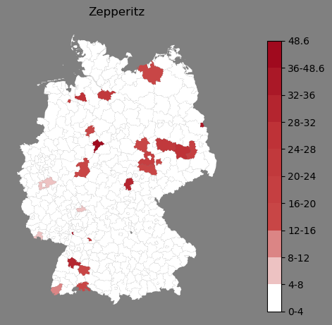 Relative Verteilung des Namens Zepperitz (1996)Direkt zur Karte Die Farbskala zeigt die Anzahl von "Zepperitz" bezogen auf je 1 Million Einträge. |