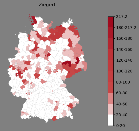 Relative Verteilung des Namens Ziegert (1996)Direkt zur Karte Die Farbskala zeigt die Anzahl von "Ziegert" bezogen auf je 1 Million Einträge. |