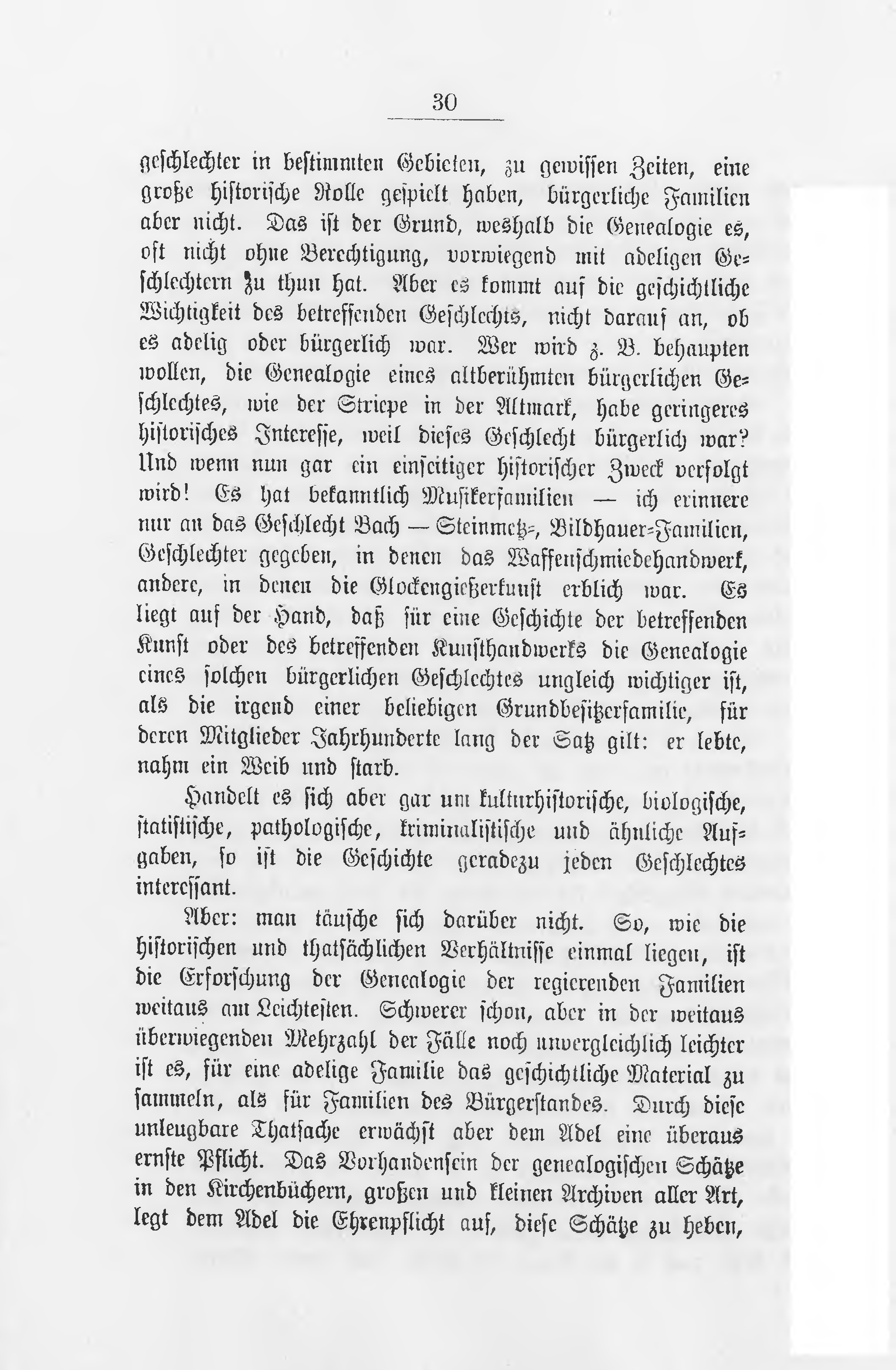 in bestimmten Gebieten, zu gewissen Zeiten, eine große historische Rolle gespielt haben, bürgerliche Familien aber nicht. Das ist der Grund, weshalb die Genealogie es, oft nicht ohne Berechtigung, vorwiegend mit adeligen Geschlechtern zu thun hat. Aber es kommt auf die geschichtliche Wichtigkeit des betreffenden Geschlechts, nicht darauf an, ob es adelig oder bürgerlich war. Wer wird z. B. behaupten wollen, die Genealogie eines altberühmten bürgerlichen Geschlechtes, wie der Striepe in der Altmark, habe geringeres historisches Interesse, weil dieses Geschlecht bürgerlich war? Und wenn nun gar ein einseitiger historischer Zweck verfolgt wird! Es hat bekanntlich Musikerfamilien – ich erinnere nur an das Geschlecht Bach – Steinmetz-, Bildhauer-Familien, Geschlechter gegeben, in denen das Waffenschmiedehandwerk, andere, in denen die Glockengießerkunst erblich war. Es liegt auf der Hand, daß für eine Geschichte der betreffenden Kunst oder des betreffenden Kunsthandwerks die Genealogie eines solchen bürgerlichen Geschlechtes ungleich wichtiger ist, als die irgend einer beliebigen Grundbesitzerfamilie, für deren Mitglieder Jahrhunderte lang der Satz gilt: er lebte, nahm ein Weib und starb.