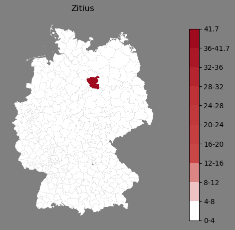 Relative Verteilung des Namens Zitius (1996)Direkt zur Karte Die Farbskala zeigt die Anzahl von "Zitius" bezogen auf je 1 Million Einträge. |