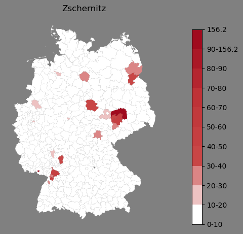 Relative Verteilung des Namens Zschernitz (1996)Direkt zur Karte Die Farbskala zeigt die Anzahl von "Zschernitz" bezogen auf je 1 Million Einträge. |