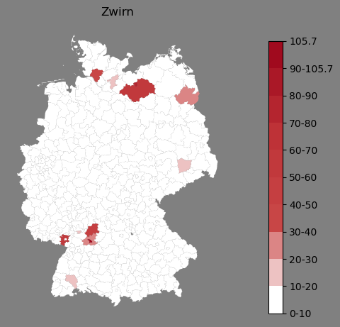 Relative Verteilung des Namens Zwirn (1996)Direkt zur Karte Die Farbskala zeigt die Anzahl von "Zwirn" bezogen auf je 1 Million Einträge. |