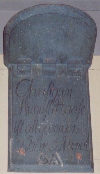 | aktuell | 17:14, 29. Nov. 2009 | 347 × 604 (61 KB) | Kerstintoeppe (Diskussion • Beiträge) | {{Information |Beschreibung = Totenkronenbrett von Christgan August Haase |Quelle = eigenes Foto |Urheber = Monika Töppe |Datum = 12.09.2009 |Scans = |Genehmigung = durch Monika Töppe erteilt |Andere Versionen = |Anmerkungen = }} |