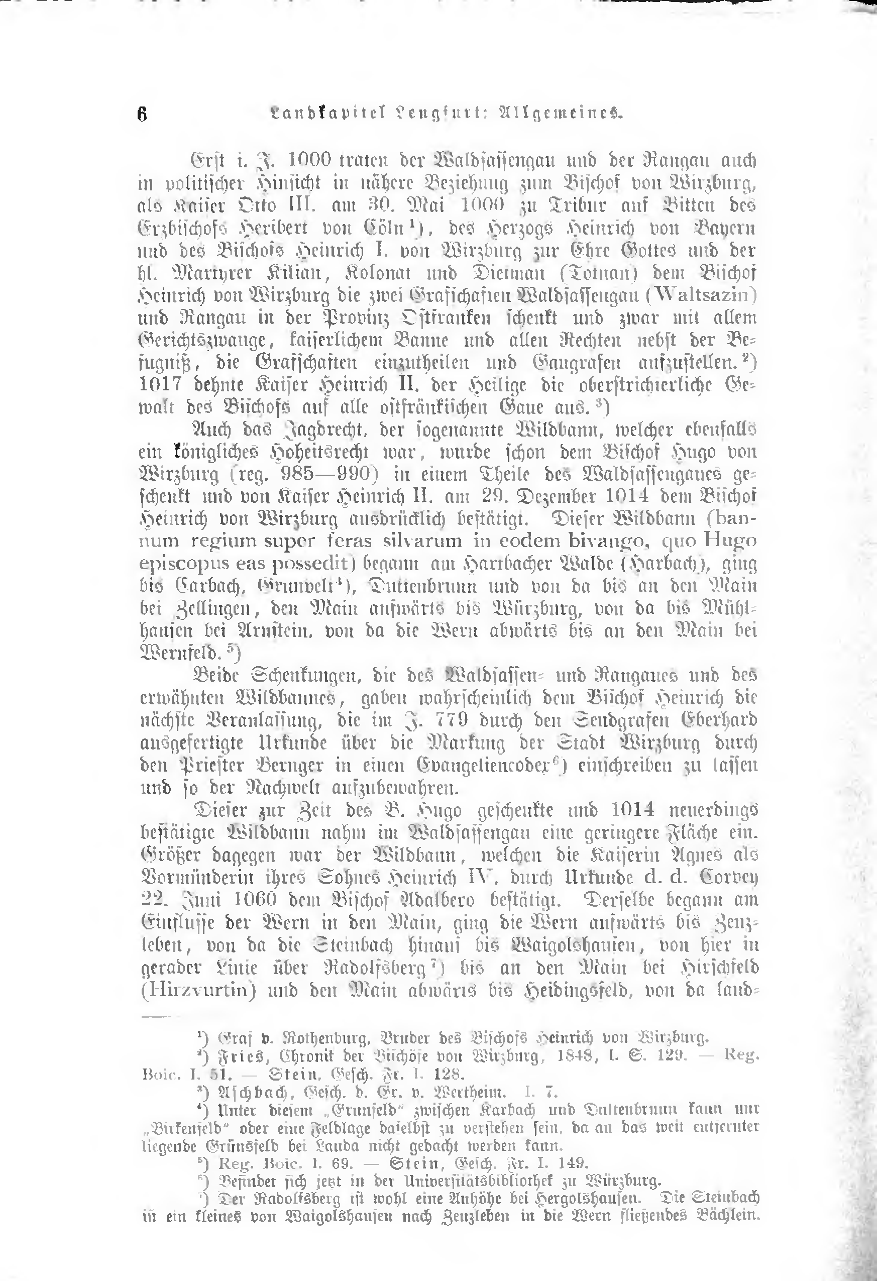 Erst i. J. 1000 traten der Waldsassengau und der Raugau auch in politischer Hinsicht in nähere Beziehung zum Bischof von Wirzburg, als Kaiser Otto III. am 30. Mai 1000 zu Tribur auf Bitten des Erzbischofs Heribert von Cöln[1], des Herzogs Heinrich von Bayern und des Bischofs Heinrich I. von Wirzburg zur Ehre Gottes und der hl. Martyrer Kilian, Kolonat und Dietman (Totnan) dem Bischof Heinrich von Wirzburg die zwei Grafschaften Waldsassengau (Waltsazin) und Raugau in der Provinz Ostfranken schenkt und zwar mit allem Gerichtszwange, kaiserlichem Banne und allen Rechten nebst der Befugnis, die Grafschaften einzutheilen und Gaugrafen aufzustellen.[2] 1017 dehnte Kaiser Heinrich II. der Heilige die oberstrichterliche Gewalt des Bischofs auf alle ostfränkischen Gaue aus.[3] Auch das Jagdrecht, der sogenannte Wildban, welcher ebenfalls ein königliches Hoheitsrecht war, wurde schon dem Bischof Hugo von Wirzburg (reg. 985-990) in einem Theile des Waldsassengaues geschenkt und von Kaiser Heinrich II. am 29 Dezember 1014 dem Bischof Heinrich von Wirzburg ausdrücklich bestätigt. Dieser Wildbann (bannum regium super feras silvarum in eodem bivango, quo Hugo episcopus eas possedit) begann am Hartbacher Walde (Harbach), ging bis Carbach, Grunvelt [4], Duttenbrunn und von da bis an den Main bei Zellingen, den Main aufwärts bis Würzburg, von da bis Mühlhausen bei Arnstein, von da die Wern abwärts bis an den Main bei Wernfeld.[5] Beide Schenkungen, die des Waldsassen- und des Raugaues und des erwähnten Wildbannes, gaben wahrscheinlich dem Bischof Heinrich die nächste Veranlassung, die im J. 779 durch den Centgrafen Eberhard ausgefertigte Urkunde über die Markung der Stadt Wirzburg durch den Priester Beruger in einem Evangeliencodex [6]einschreiben zu lassen und so der Nachwelt aufzubewahren. Dieser zur Zeit des B. Hugo geschenkte und 1014 neuerdings bestätigte Wildbann nahm im Waldsassengau eine geringe Fläche ein. Größer dagegen war der Wildbann, welchen die Kaiserin Agnes als Vormünderin ihres Sohnes Heinrich IV. durch Urkunde d.d.Corbey 22. Juni 1060 dem Bischof Adalbero bestätigt. Derselbe begann am Einflusse der Wern in den Main, ging die Wern aufwärts bis Zeuzleben, von da die Steinbach hinauf bis Waigoldshausen, von hier in gerader Linie über Radolfsberg [7]bis an den Main bei Hirschfeld (Hirzvurtin) und den Main abwärts bis Heidingsfeld, von da land-