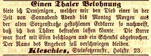 Einwohner: Block, W., Kreisgerichts-Wachtmstr.a.D.; Gröger, E., Schneidemüller; Klink, C., Oberstauer; Neumann, A., Schiffscapitain; Reinert, E., Prediger; Ruthenberg, J., Hausz.-Ges.; Trapp, H., Schiffscapitain; - 1866