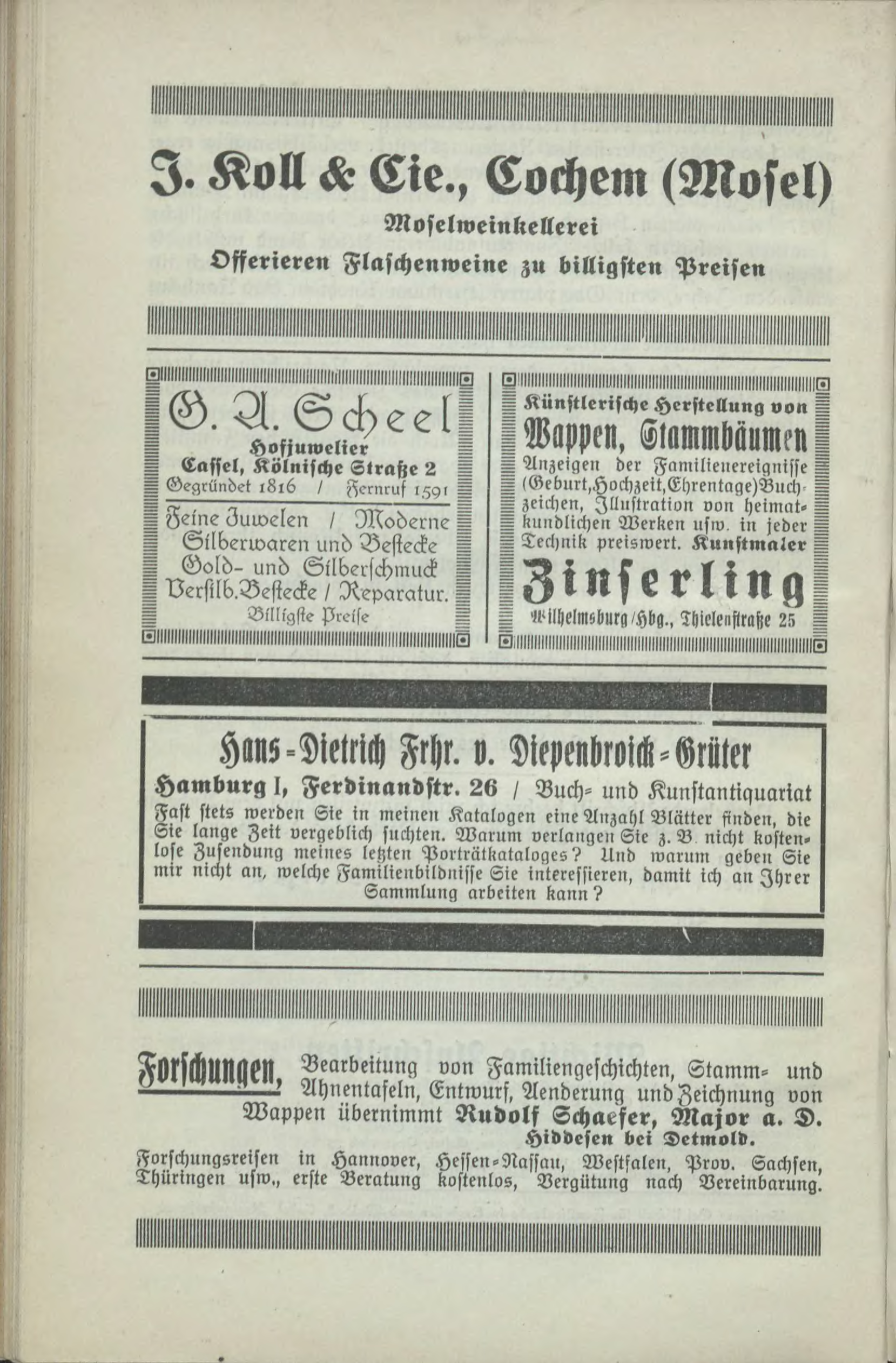 Wappen übernimmt Rudolf Tchaefer, Major a. D. Hiddefen bei Detmold. Forschungsreisen in Hannover, Hessen «Nassau, Westfalen, Pruv. Sachsen, Thüringen usw., erste Beratung kostenlos, Vergütung nach Vereinbarung.