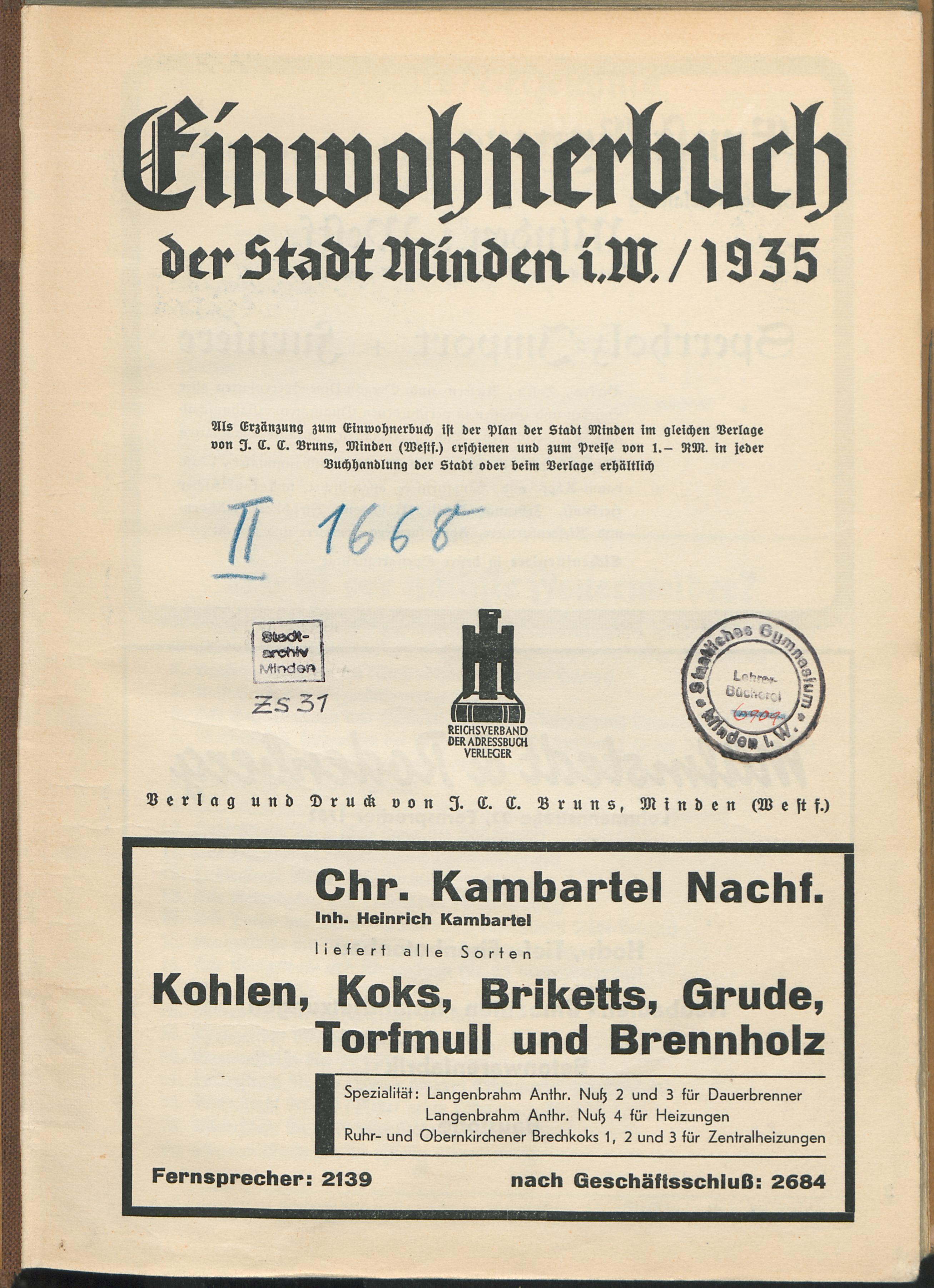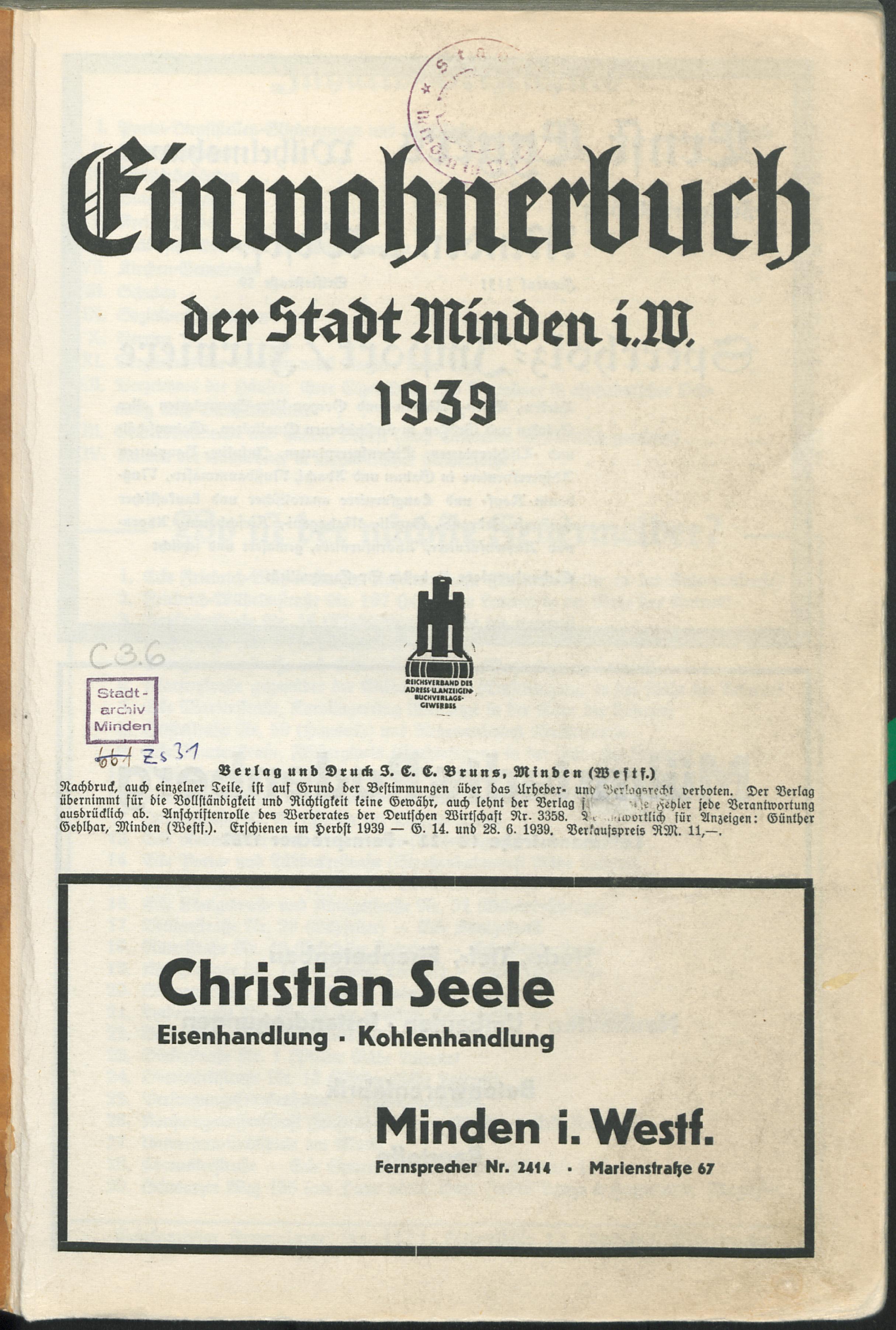 340 KB | {{Information |Beschreibung = ''Vollständiges Adreßbuch der Stadt Minden für 1862. Aus amtlichen Quellen zusammen getragen'', Minden: Druck und Verlag der F. W. H. Müller’schen Buchdruckerei, 1862. |Quelle = [http://www.archive.nrw.de/Kommunalarchi | 1 |