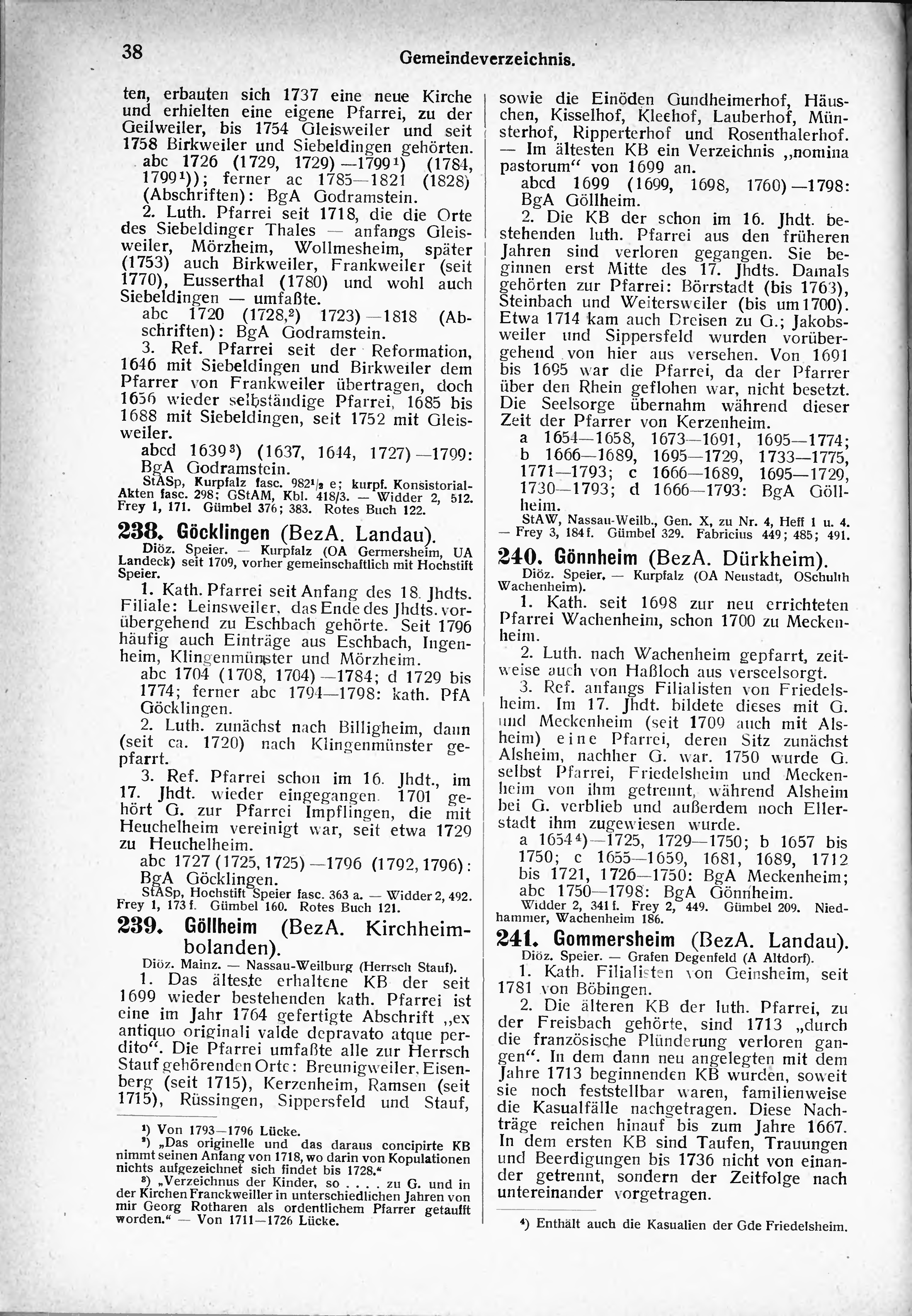 1. Das älteste erhaltene KB der seit 1699 wieder bestehenden kath. Pfarrei ist eine im Jahr 1764 gefertigte Abschrift „ex antiquo originali valde depravato atque perdito". Die Pfarrei umfaßte alle zur Herrsch Stauf gehörenden Orte: Breunigweiler. Eisenberg (seit 1715), Kerzenheim, Ramsen (seit 1715), Rüssingen, Sippersfeld und Stauf, sowie die Einöden Gundheimerhof, Häuschen, Kisselhof, Kleehof, Lauberhof, Münsterhof, Ripperterhof und Rosenthalerhof. — Im ältesten KB ein Verzeichnis „nomina pastorum" von 1699 an. abcd 1699 (1699, 1698, 1760)—1798: BgA Göllheim. 2. Die KB der schon im 16. Jhdt. bestehenden luth. Pfarrei aus den früheren Jahren sind verloren gegangen. Sie beginnen erst Mitte des 17. Jhdts. Damals gehörten zur Pfarrei: Börrstadt (bis 1763), Steinbach und Weitersweiler (bis um 1700). Etwa 1714 kam auch Dreisen zu G.; Jakobsweiler und Sippersfeld wurden vorübergehend von hier aus versehen. Von 1691 bis 1695 war die Pfarrei, da der Pfarrer über den Rhein geflohen war, nicht besetzt. Die Seelsorge übernahm während dieser Zeit der Pfarrer von Kerzenheim. a 1654-1658, 1673—1691, 1695—1774; b 1666-1689, 1695—1729, 1733—1775, 1771—1793; c 1666—1689, 1695—1729, 1730—1793; d 1666—1793: BgA Göllheim.