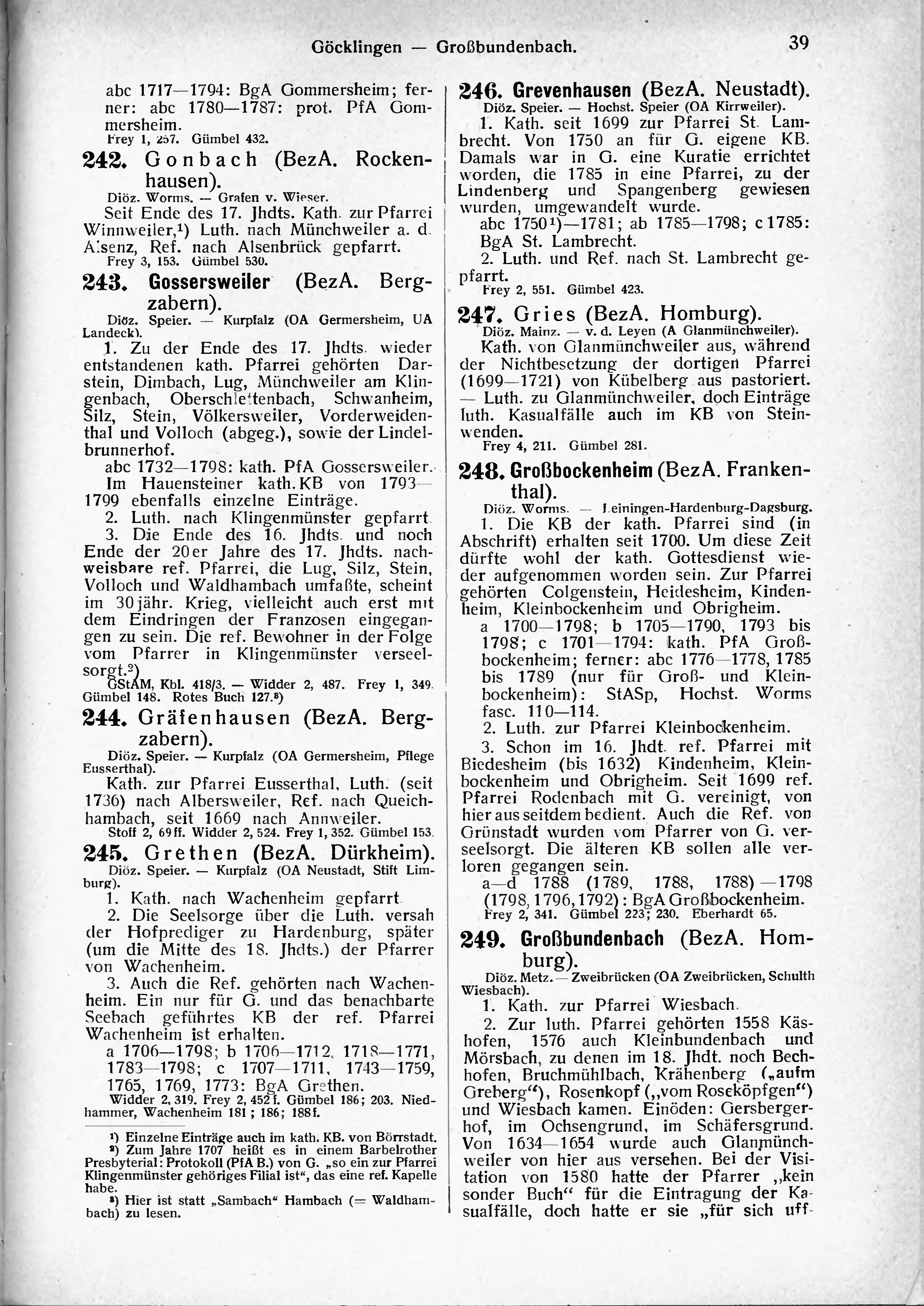 3. Schon im 16. Jhdt. ref. Pfarrei mit Biedesheim (bis 1632) Kindenheim, Kleinbockenheim und Obrigheim. Seit 1699 ref. Pfarrei Rodenbach mit G. vereinigt, von hier aus seitdem bedient. Auch die Ref. von Grünstadt wurden vom Pfarrer von G. ver-seelsorgt. Die älteren KB sollen alle verloren gegangen sein.