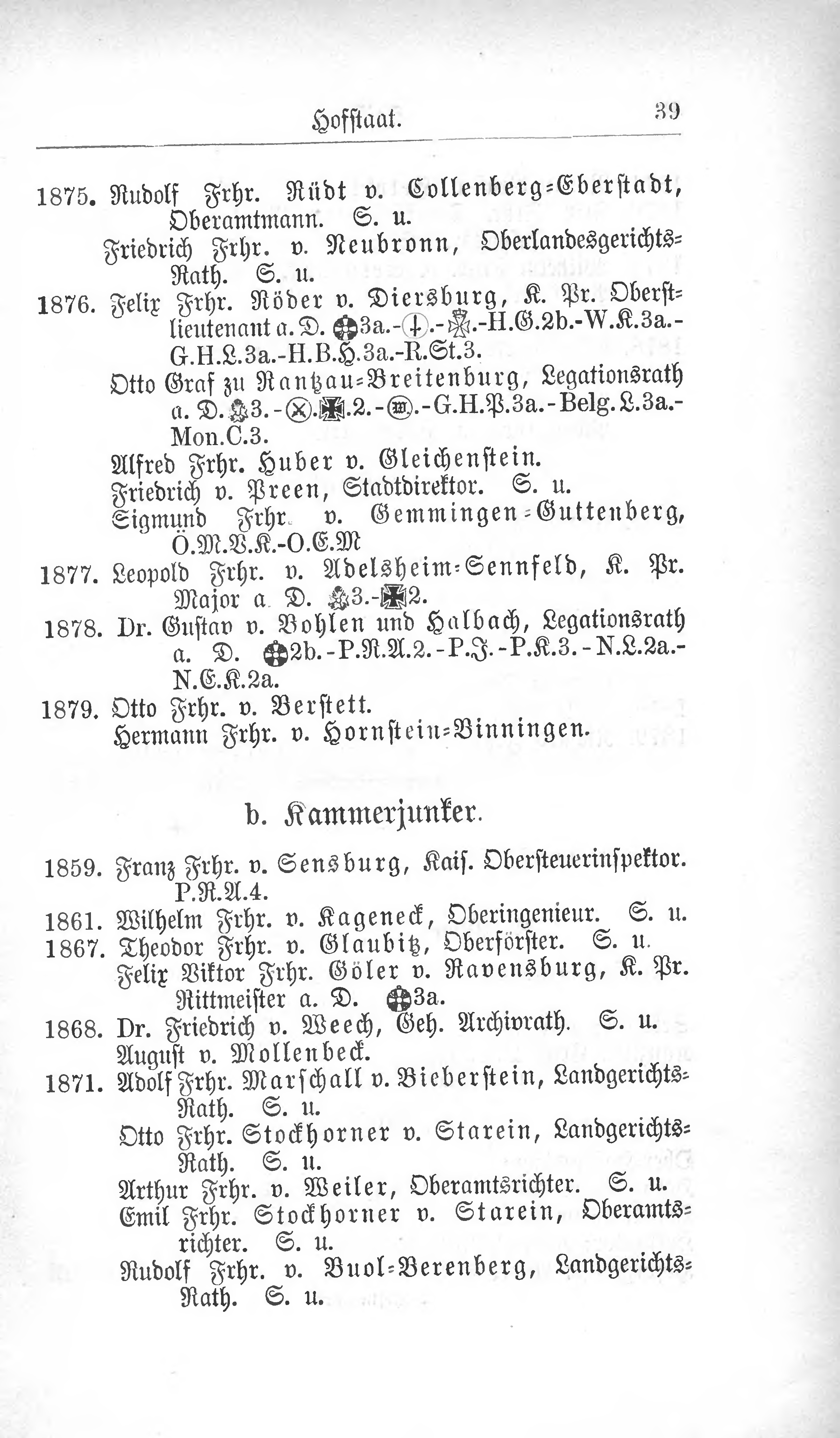 1877. Leopold Frhr. ''v. Adelsheim-Sennfeld'', K. Pr. Major a. D. [[../XII#Orden_2|Orden_2 3 ]] - [[../ | 1877. Leopold Frhr. ''v. Adelsheim-Sennfeld'', K. Pr. Major a. D. [[../XII#Orden_2|Orden_2 3 ]] - [[../XIV#Orden_91|Orden_91 ]]. | ||