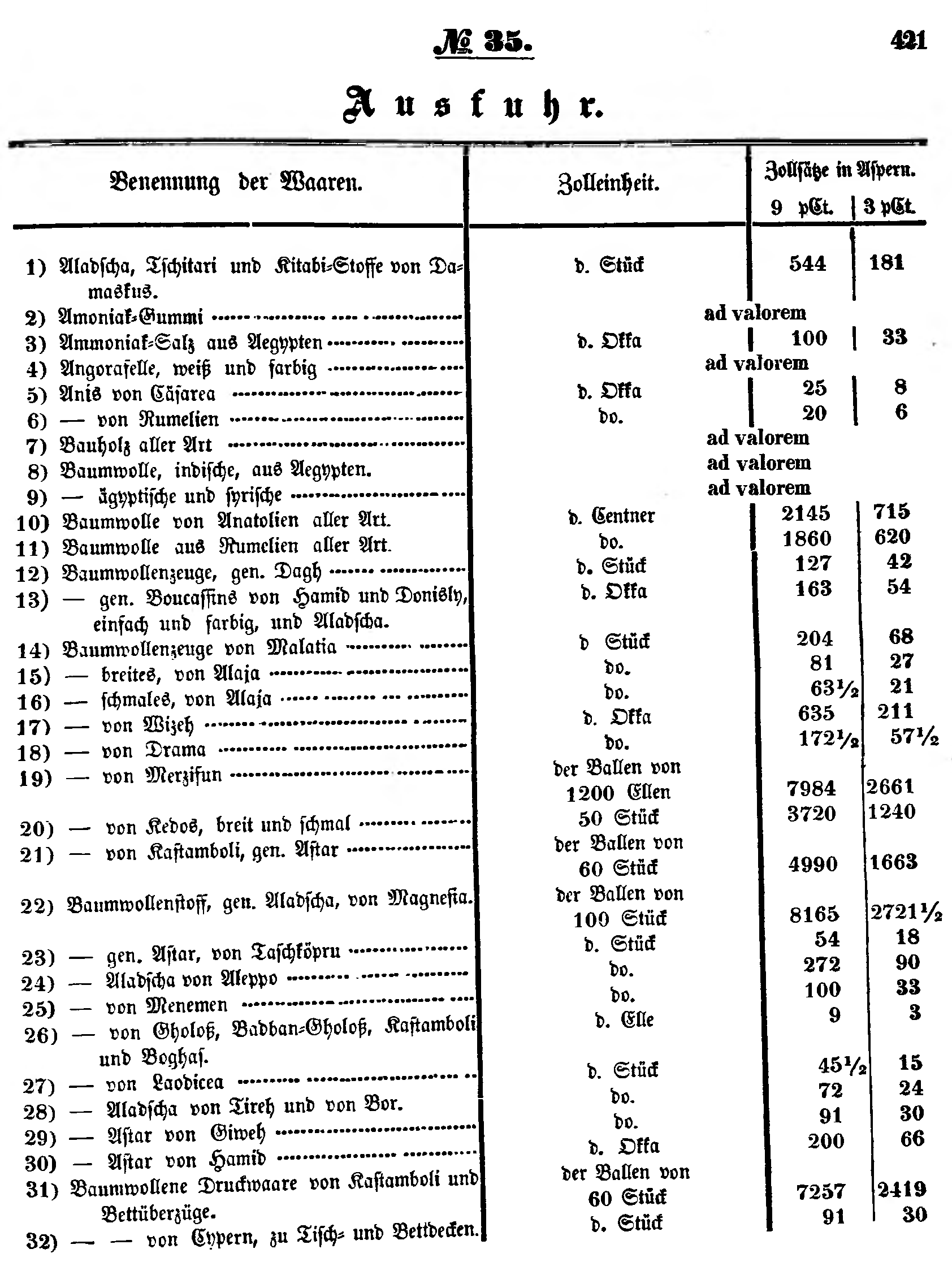 | 10) Baumwolle von Anatolien aller Art. | d. Centner | 2145 | 715 |
