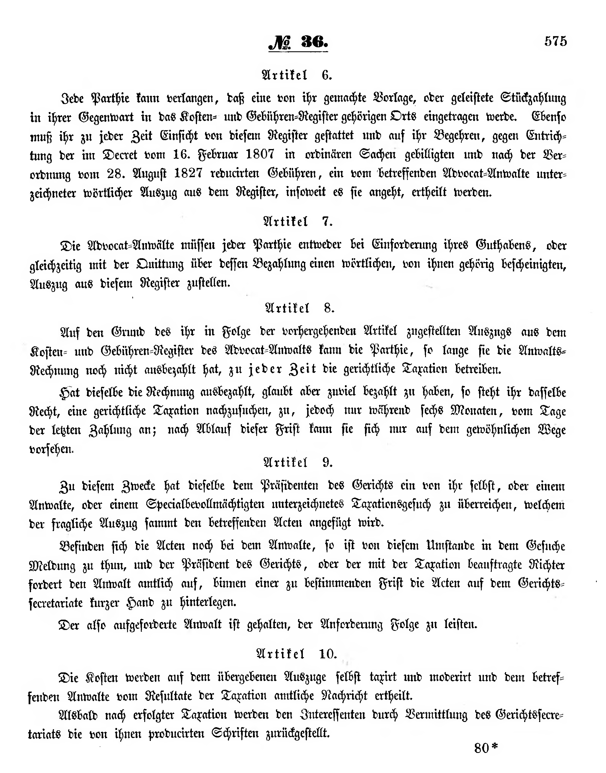 Auf den Grund des ihr in Folge der vorhergehenden Artikel zugestellten Auszugs aus dem Kosten- und Gebühren-Register des Advocat-Anwalts kann die Parthie, so lange sie die AnwaltsRechnung noch nicht ausbezahlt hat, zu jeder Zeit die gerichtliche Taxation betreiben.