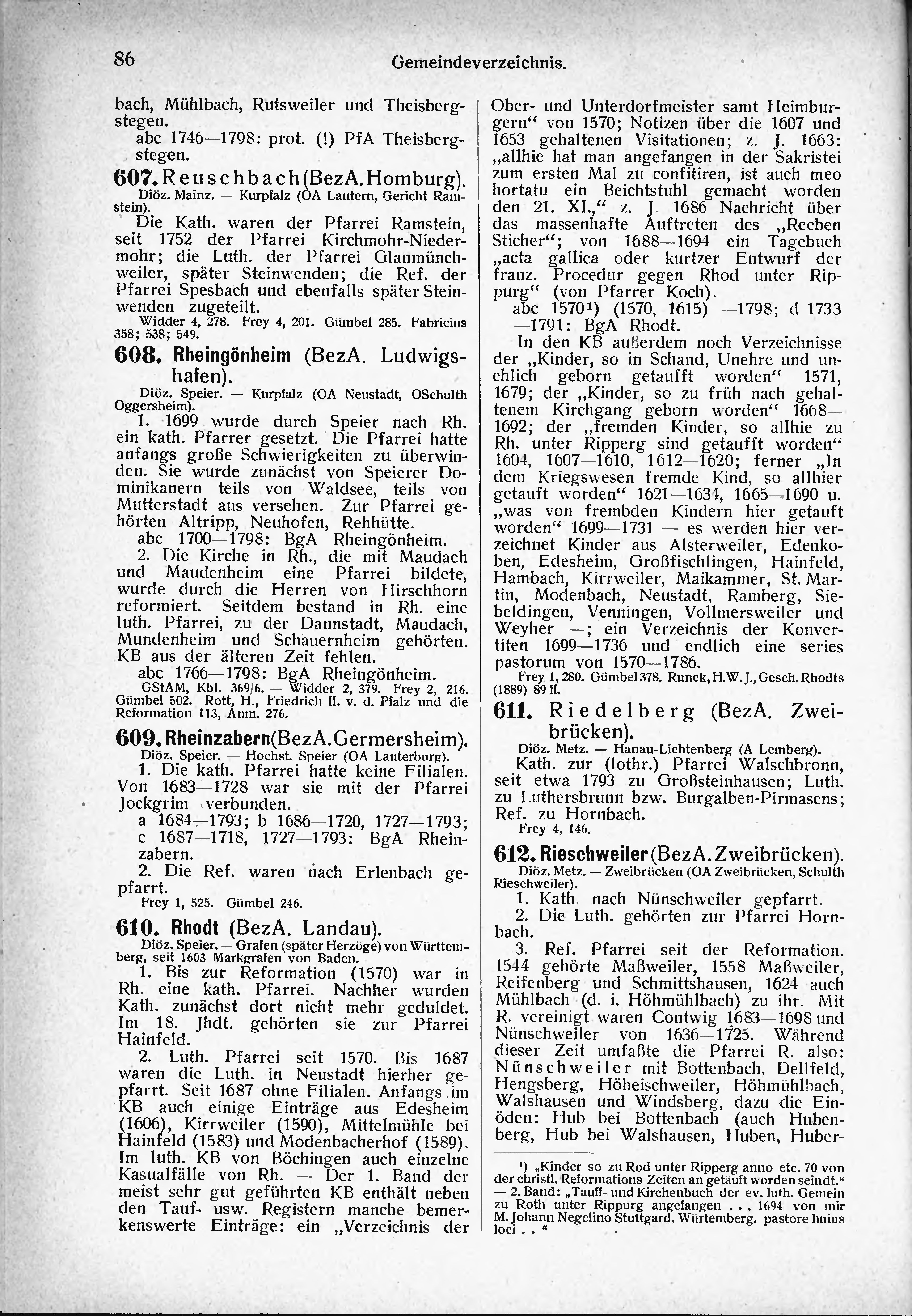 In den KB außerdem noch Verzeichnisse der „Kinder, so in Schand, Unehre und unehlich geborn getaufft worden" 1571, 1679; der „Kinder, so zu früh nach gehaltenem Kirchgang geborn worden" 1668— 1692; der „fremden Kinder, so allhie zu Rh. unter Ripperg sind getaufft worden" 1604, 1607—1610, 1612—1620; ferner „In dem Kriegswesen fremde Kind, so allhier getauft worden" 1621—1634, 1665—1690 u. „was von frembden Kindern hier getauft worden" 1699—1731 — es werden hier verzeichnet Kinder aus Alsterweiler, Edenkoben, Edesheim, Großfischlingen, Hainfeld, Hambach, Kirrweiler, Maikammer, St. Martin, Modenbach, Neustadt, Ramberg, Siebeldingen, Venningen, Vollmersweiler und Weyher —; ein Verzeichnis der Konvertiten 1699—1736 und endlich eine series pastorum von 1570—1786.