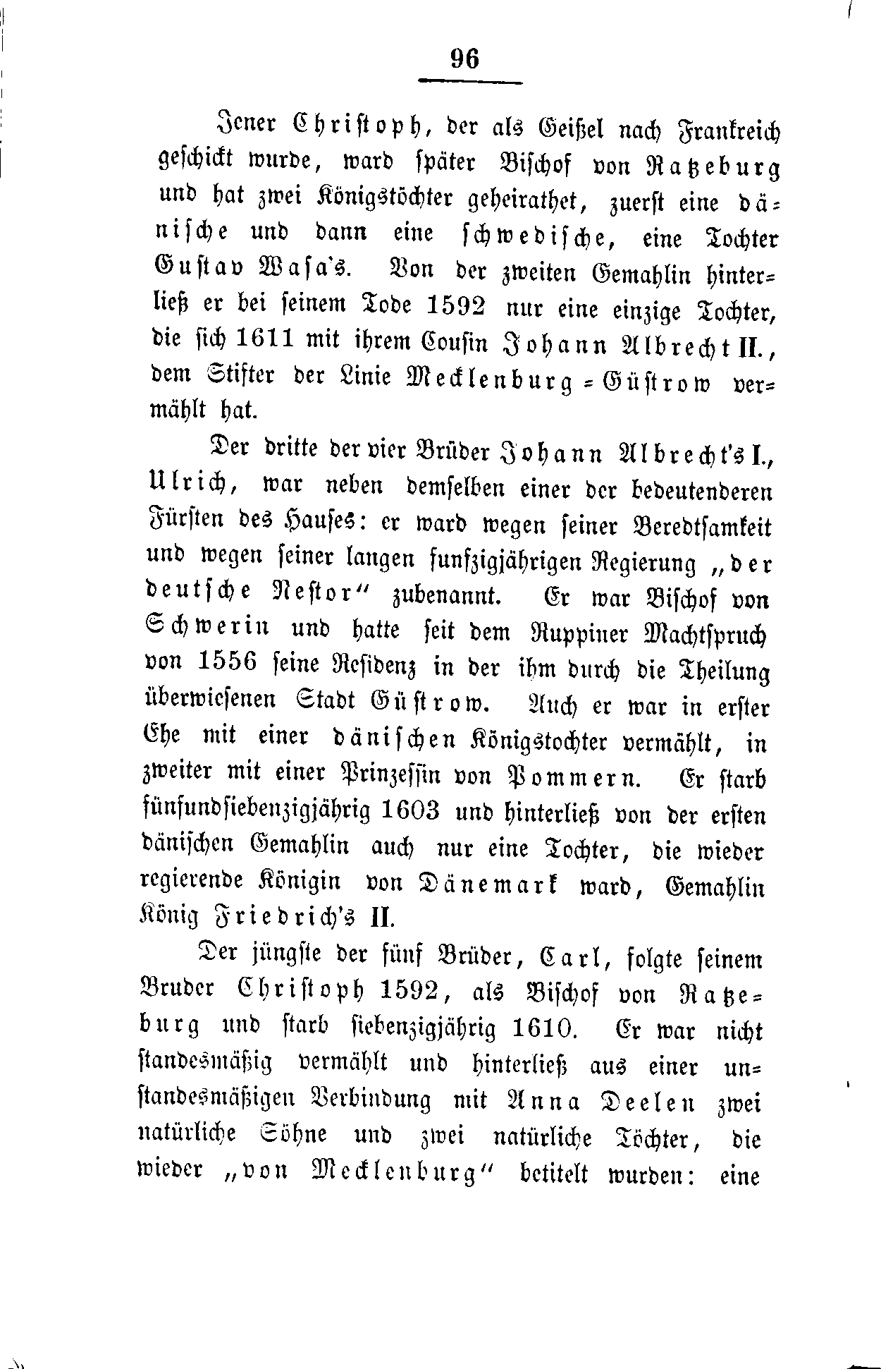 Jener {{Sperrschrift|Christoph,}} der als Geißel nach Frnkreich geschickt wurde, ward später Bischof von Ratzeburg und hat zwei Königstöchter geheirathet zuerst eine dänische und dann eine schwedische, eine Tochter {{Sperrschrift|Gustav Wasa's.}} Von der zweiten Gemahlin hinterließ er bei seinem Tode 1592 nur eine einzige Tochter, die sich 1611 mit ihrem Cousin {{Sperrschrift|Johann Albrecht II.,}} dem Stifter der Linie Mecklenburg-Güstrow vermählt hat. | |||