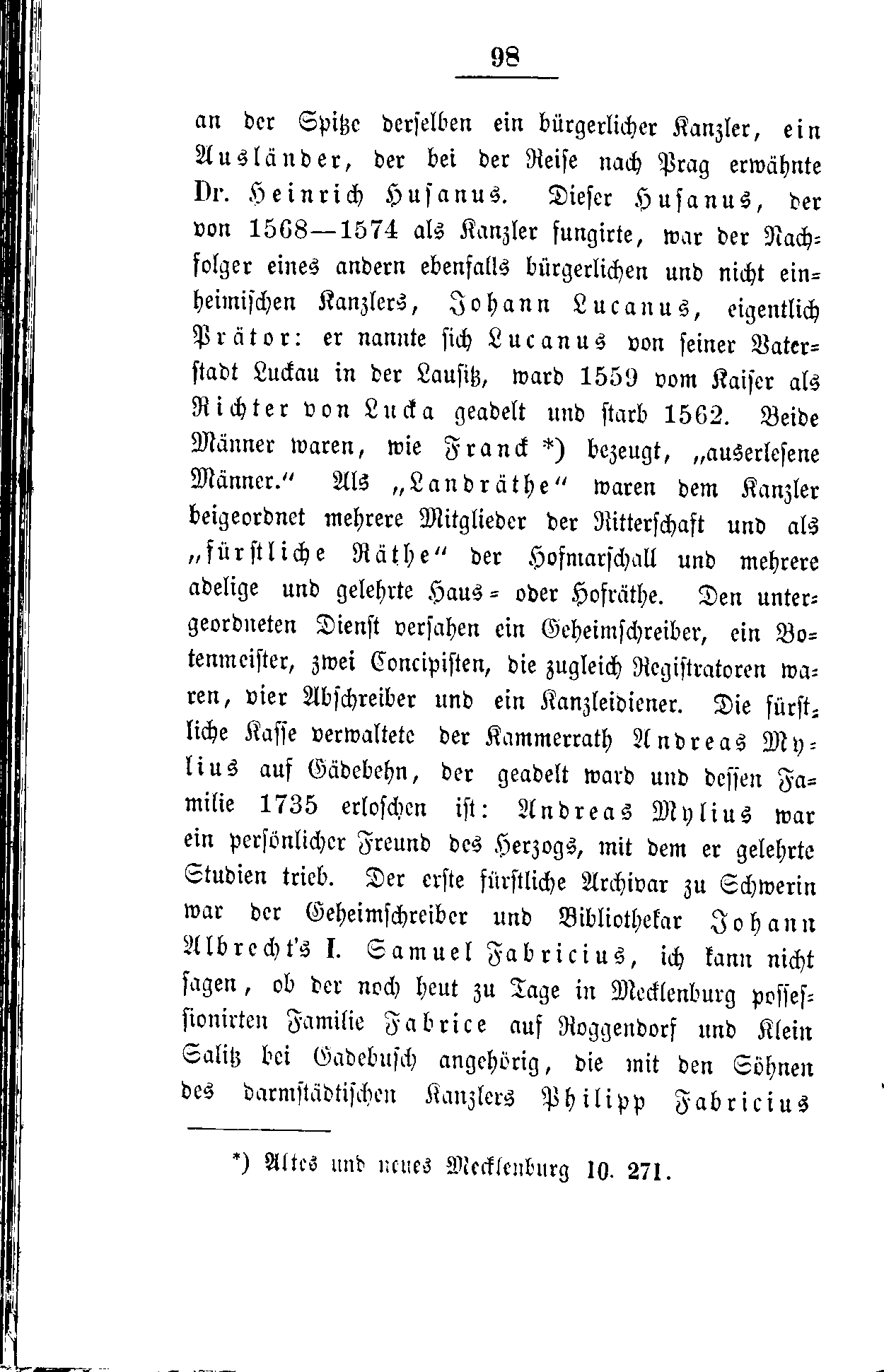 an der Spitze derselben ein bürgerlicher Kanzler, ein Ausländer, der bei der Reise nach Prag erwähnte Dr. Heinrich Husanus. Dieser Husanus, der von 1568 - 1574 als Kanzler fungirte, war der Nachfolges eines andern ebenfalls bürgerlichen und nicht einheimischen Kanzler, Johann Lucanus, eigentlich Prätor: er nannte sich Lucanus von seiner Vaterstadt Luckau in der Lausitz, ward 1559 vom Kaiser als Richter von Lucka geadelt und starb 1562. Beide Männer waren, wie Franck[1] bezeugt, „auserlesene Männer.“ Als „Landräthe“ waren dem Kanzler beigeordnet mehrere Mitglieder der Ritterschaft und als „fürstliche Räthe“ der Hofmarschall und mehrere adelige und gelegrte Haus- oder Hofräthe. Den untergeordneten Dienst versagen ein Geheimschreiber, ein Botenmeister, zwei Concipisten, die zugleich Registraturen waren, vier Abschreiber und ein Kanzlei----. Die fürstliche Kasse verwaltete der Kammerrath Andreas Mylius auf Gädebehn, der geadelt ward und dessen Familie 1735 erloschen ist: Andreas Mylius war ein persönlicher Freund des Herzogs, mit dem er gelehrte Studien trieb. Der erste fürstliche Archivar zu Schwerin war der Geheimschreiber und Bibliothekar Johann Albrechts I. Samuel Fabricius, ich kann nicht sagen, ob der noch heut zu Tage in Mecklenburg possessionirten Familie Fabrice auf Roggendorf und Klein Salitz bei Gadebusch angehörig, die mit den Söhnen des darmstädtischen Kanzlers Phillip Fabricius