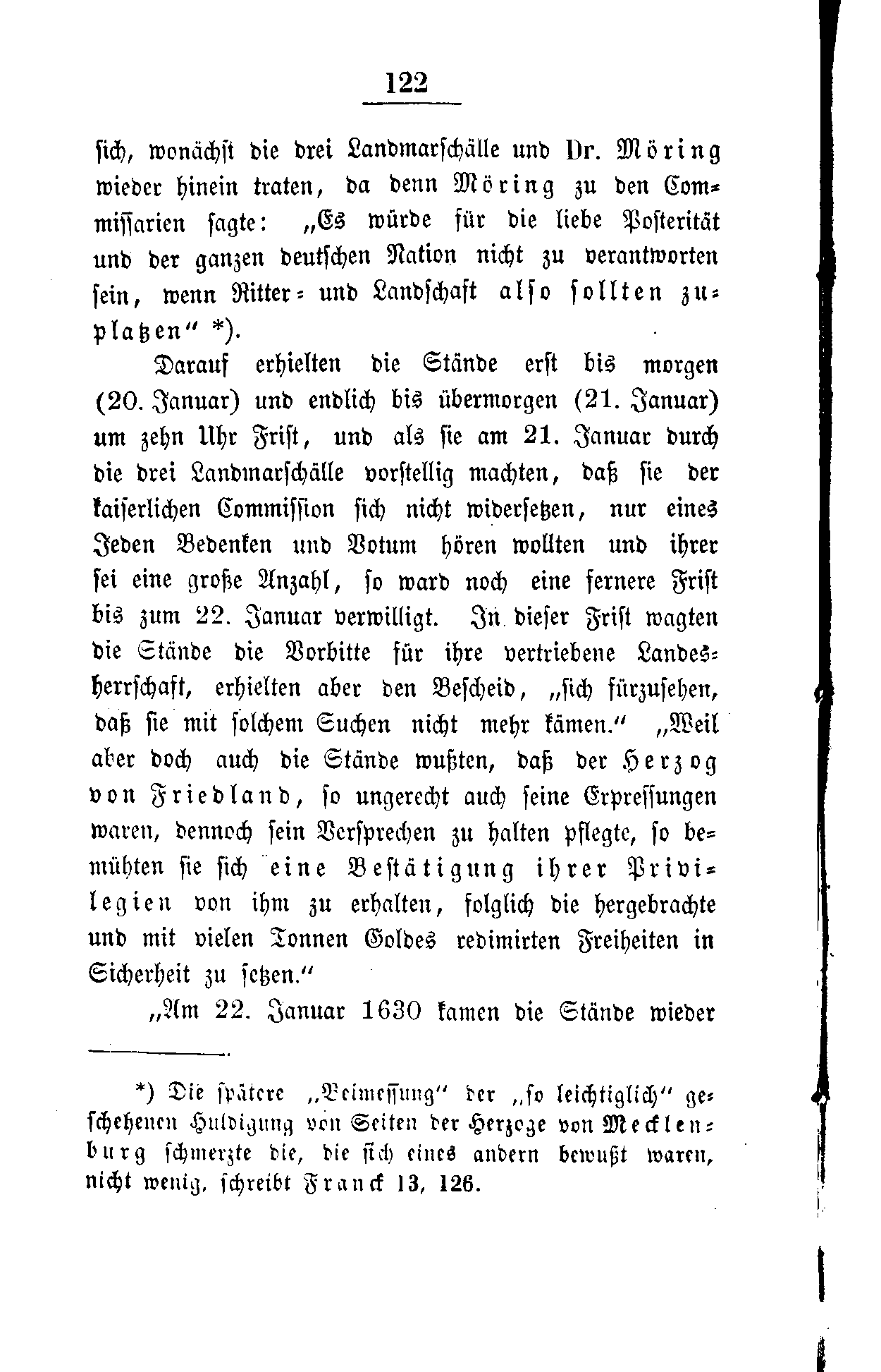 Darauf erhielten die Stände erst bis morgen (20, Januar) und endlich bis übermorgen (21. Januar) um zehn Uhr Frist, und als sie am 21. Januar durch die drei Landmarschälle vorstellig machten, daß sie der kaiserlichen Commission sich nicht widersetzen, nur eines Jeden Bedenken und Votum hören wollten und ihrer sei eine große Anzahl, so ward noch eine fernere Frist bis zum 22. Januar verwilligt. In dieser Frist wagten die Stände die Vorbitte für ihre vertriebene Landesherrschaft, erhielten aber den Bescheid, „sich fürzusehen, daß sie mit solchem Suchen nicht mehr kämen." „Weil aber doch auch die Stände wußten, daß der Herzog von Friedland, so ungerecht auch seine Erpressungen waren, dennoch sein Versprechen zu halten pflegte, so bemühten sie sich eine Bestätigung ihrer Privi legien von ihm zu erhalten, folglich die hergebrachte und mit vielen Tonnen Goldes redimirten Freiheiten in Sicherheit zu setzen."