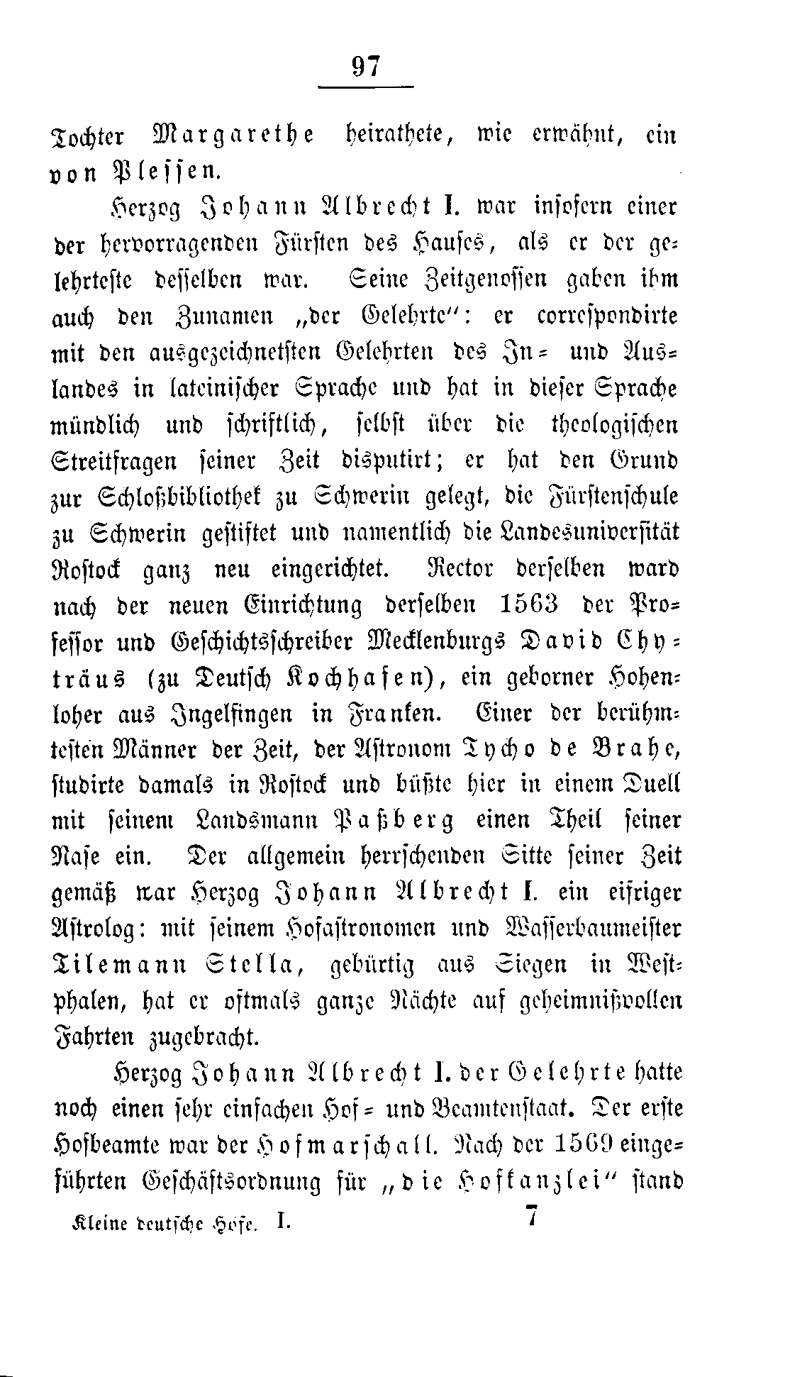 Herzog {{Sperrschrift|Johann Albrecht I.}} war insofern einer der hervorragenden Fürsten des Hauses, als er der gelehrteste desselben war. Seine Zeitgenossen gaben ihm auch den Zunamen {{Sperrschrift|„der Gelehrte“:}} er coirespondirte mit den ausgezeichnetsten Gelehrten des In- und Auslandes in lateinischer Sprache und hat in dieser Sprache mündlich und schriftlich, selbst über die theologischen Streitfragen seiner Zeit disputirte er hat den Grund zur Schloßbibliothek zu Schwerin gelegt, die Fürstenschule zu SChwerin gestiftet und namentlich die Landesuniversität Rostock ganz neu eingerichtet. Rector derselben ward nach der neuen Einrichtung derselben 1563 der Professor und Geschichtsschreiber Mecklenburgs {{Sperrschrift|David Chyträus}} (zu deutsch Kochhafen), ein geborner {{Sperrschrift|Hohenloher}} aus Ingelsingen in Franken. EIner der berühmtesten Männer der Zeit, der Astronom {{Sperrschrift|Tycho de Brahe,}} studirte damals in Rostock und büßte hier in einem Duell mit seinem Landsmann {{Sperrschrift|Paßberg}} einen Theil seiner Nase ein. Der allgemein herrschenden Sitte seiner Zeit gemäß war Herzog {{Sperrschrift|Johann Albrecht I.}} ein eifriger Astrolog: mit seinem Hofastronomen und Wasserbaumeister {{Sperrschrift|Tilemann Stella}} gebürtig aus Siegen in Westphalen, hat er oftmals ganze Nächte auf geheimnißvollen Fahrten zugebracht. | |||
