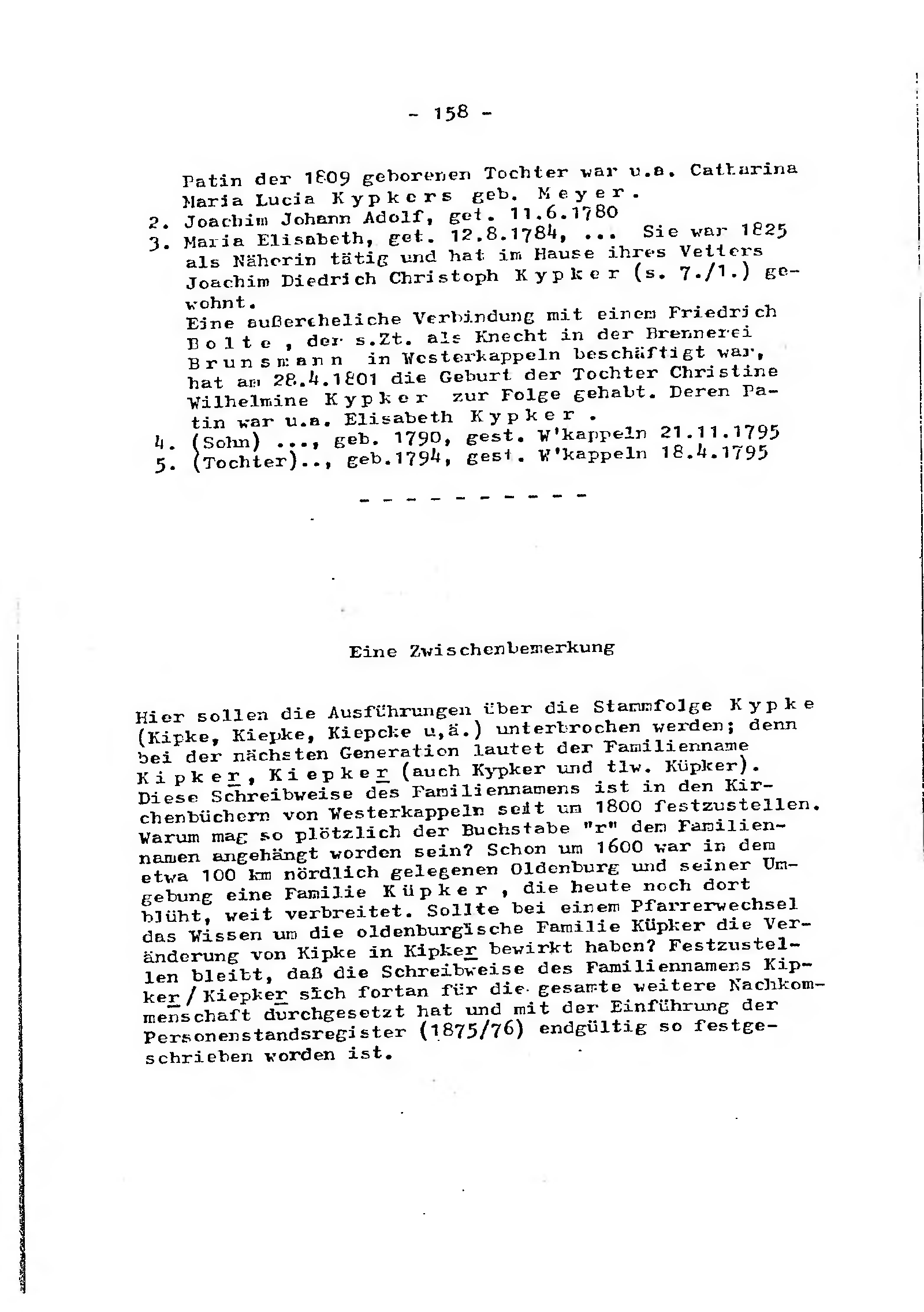 Hier sollen die Ausführungen über die Stammfolge Kypke (Kipke, Kiepke, Kiepcke u,ä.) unterbrochen werden; denn bei der nächsten Generation lautet der Familienname Kipker, Kiepker (auch Kypker und tlw. Küpker) . Diese Schreibweise des Familiennamens ist in den Kir¬chenbüchern von Westerkappeln seit um 1800 festzustellen. Warum mag so plötzlich der Buchstabe "r" dem Familien¬namen angehängt worden sein? Schon um 1600 var in dem etwa 100 km nördlich gelegenen Oldenburg und seiner Um¬gebung eine Familie Küpker, die heute noch dort blüht, weit verbreitet. Sollte bei einem Pfarrerwechsel das Wissen um die Oldenburgisehe Familie Küpker die Ver¬änderung von Kipke in Kipker bewirkt haben? Festzustellen bleibt, daß die Schreibweise des Familiennamens Kip¬ker /Kiepker sich fortan für die gesamte weitere Nachkom¬menschaft durchgesetzt hat und mit der Einführung der Personenstandsregister (1875/76) endgültig so festge¬schrieben worden ist.