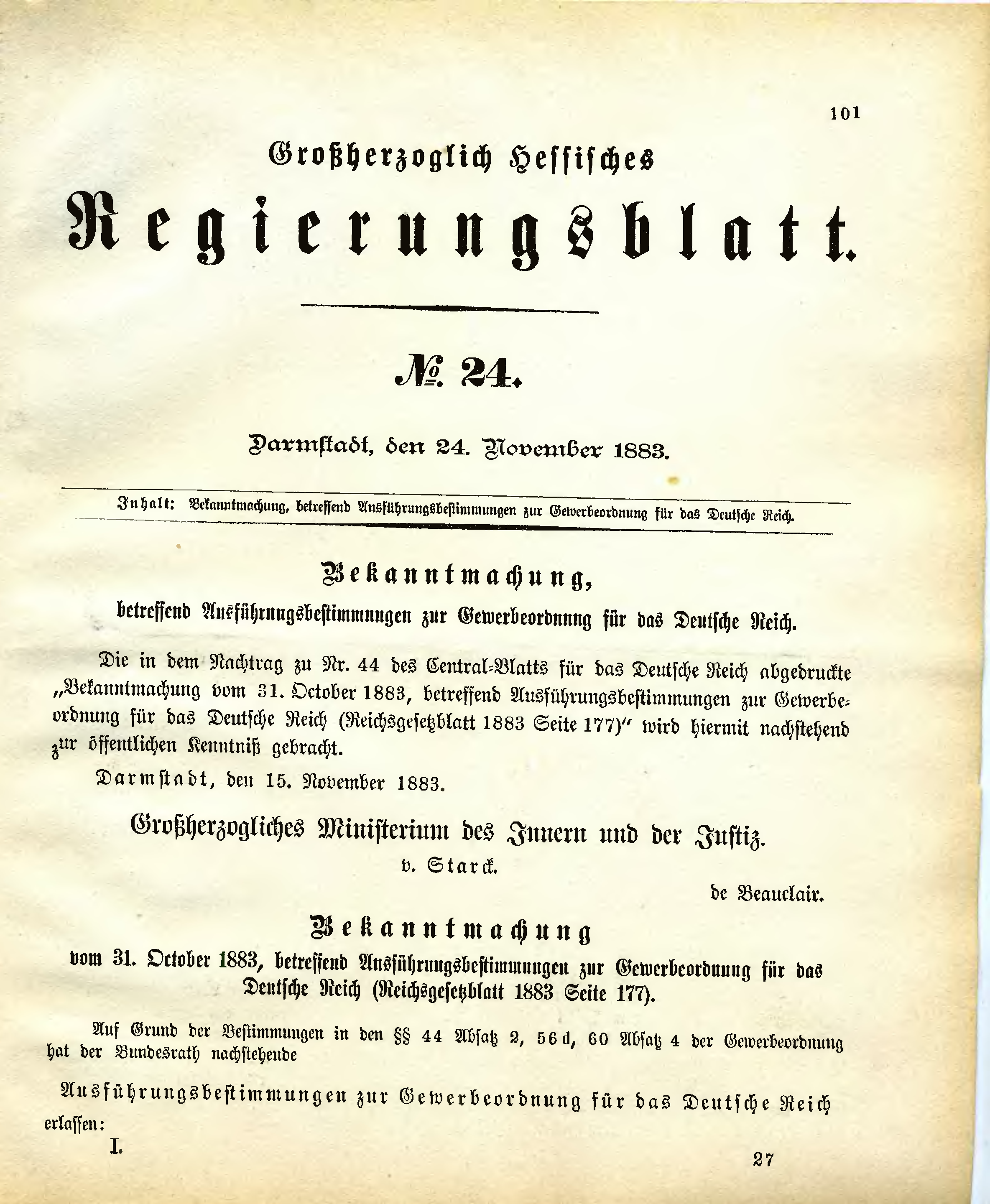 <center>'''Bekanntmachung,<br />vom 31. October 1883, betreffend Ausführungsbestimmungen zur Gewerbeordnung für das Deutsche Reich (Reichsgesetzblatt 1883 Seite 177).'''</center> | |||