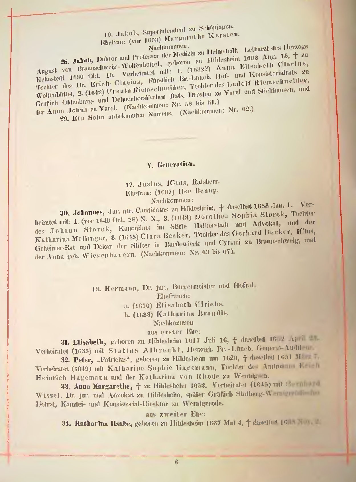 30. Johannes, Jur. utr. Candidatus zu Hildesheim, + daselbst 1653 Jan. 1. Ver¬heiratet mit: 1. (vor 1640 Oct. 28) N. N., 2. (1643) Dorothea Sophia Storck, Tochter des Johann Storck, Kanonikus im Stifte Halberstadt und Advokat, und der Katharina Mellinger, 3. (1645) Clara Becker, Tochter des Gerhard Becker, ICtus, Geheimer-Rat und Dekan der Stifter in Bardowieck und Cyriaci zu Braunschweig, und der Anna geb. Wiesenhavern. (Nachkommen: Nr. 63 bis 67).
