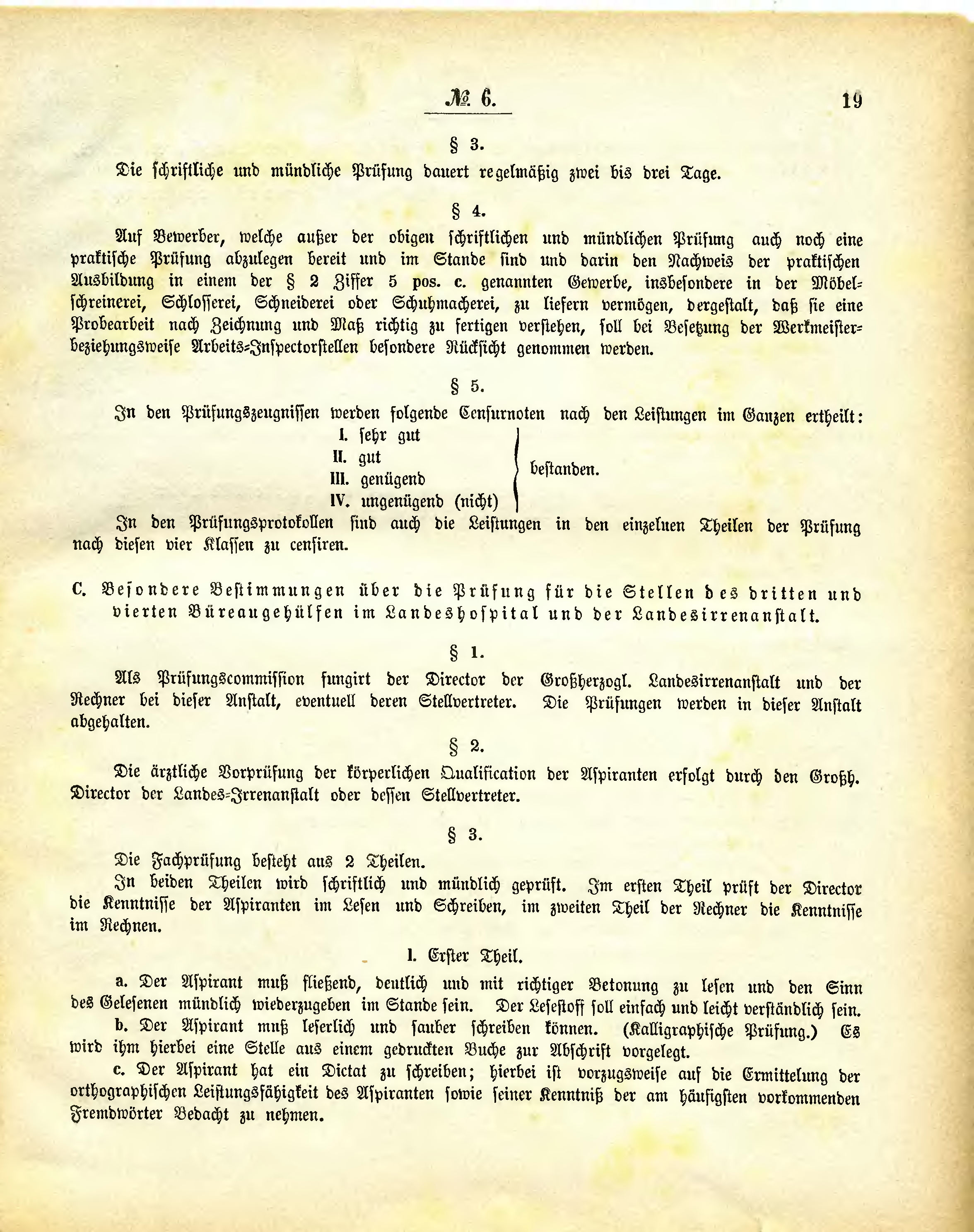 <center>{{Sperrschrift |C. Besondere Bestimmungen über die Prüfung für die Stellen des dritten und vierten Büreaugehülfen im Landeshospital und der Landesirrenanstalt.}}<br />§ 1.</center> | |||
