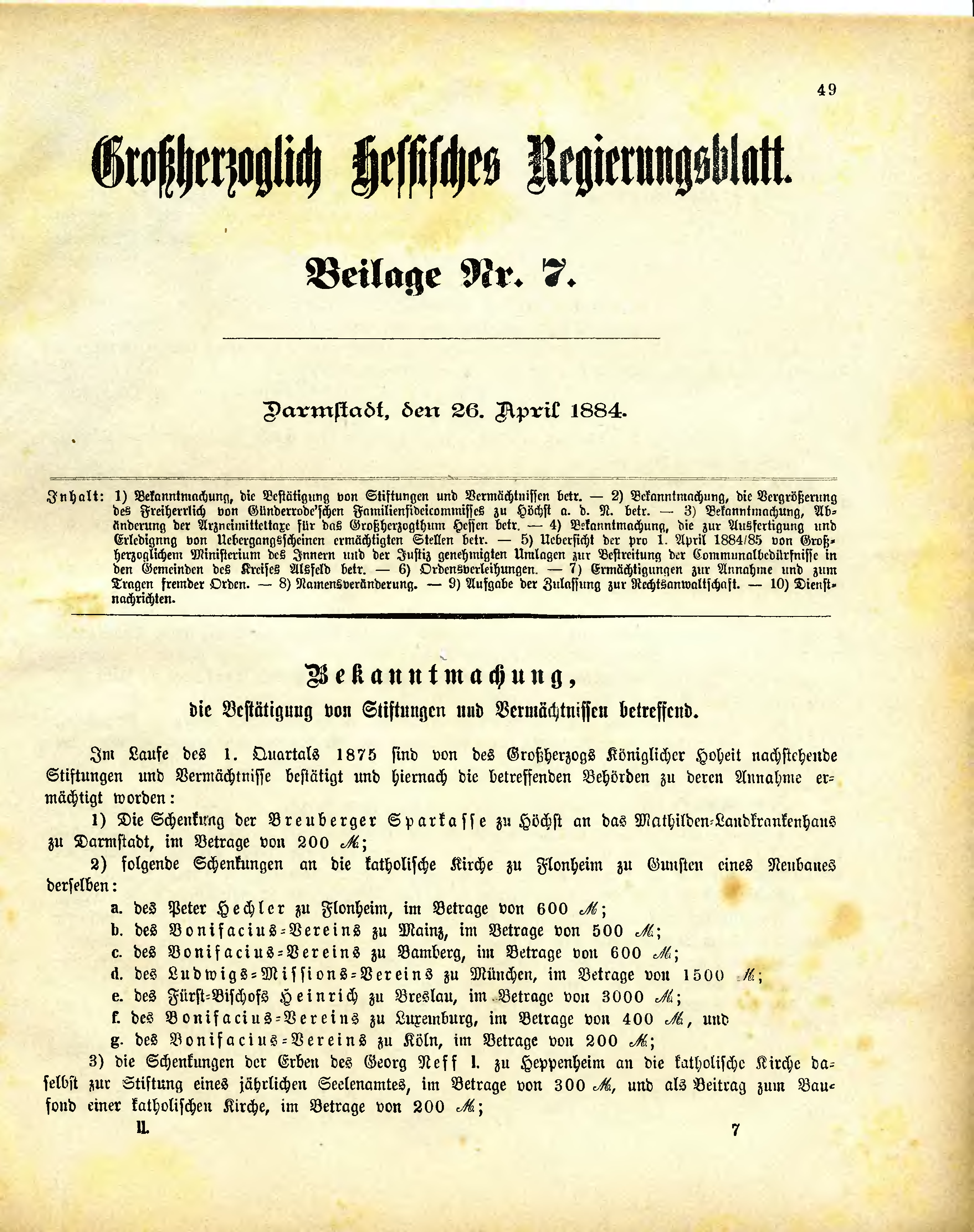 <center>'''Großherzoglich Hessisches Regierungsblatt.<br />Beilage Nr. 7.'''<br />Darmstadt, den 26. April 1884.</center> | |||