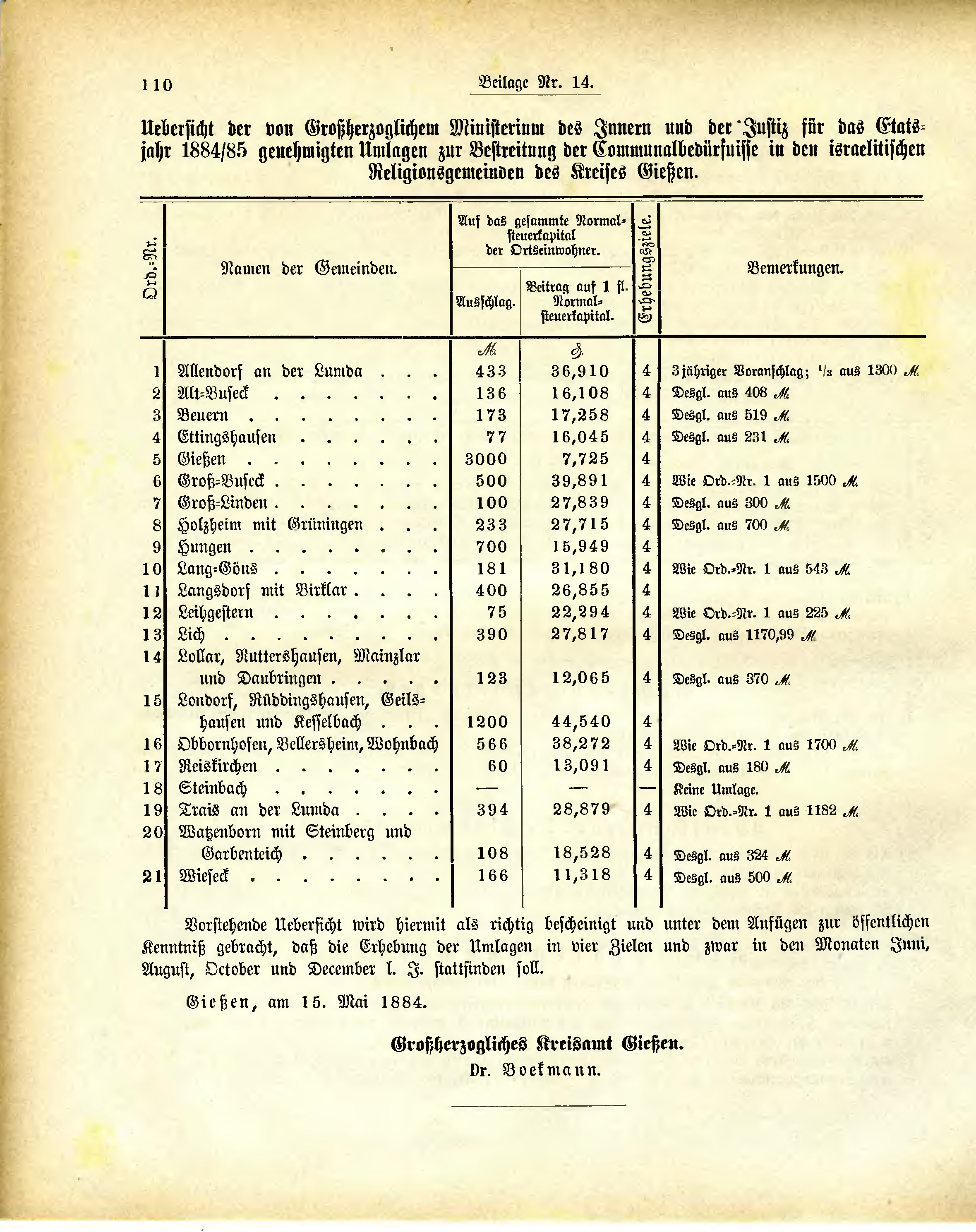 Uebersicht der von Großherzoglichem Ministerium des Innern und der Justiz für das Etatsjahr 1884/85 genehmigten Umlagen zur Bestreitung der Communalbedürfnisse in den israelitischen Religionsgemeinden des Kreises Gießen.
