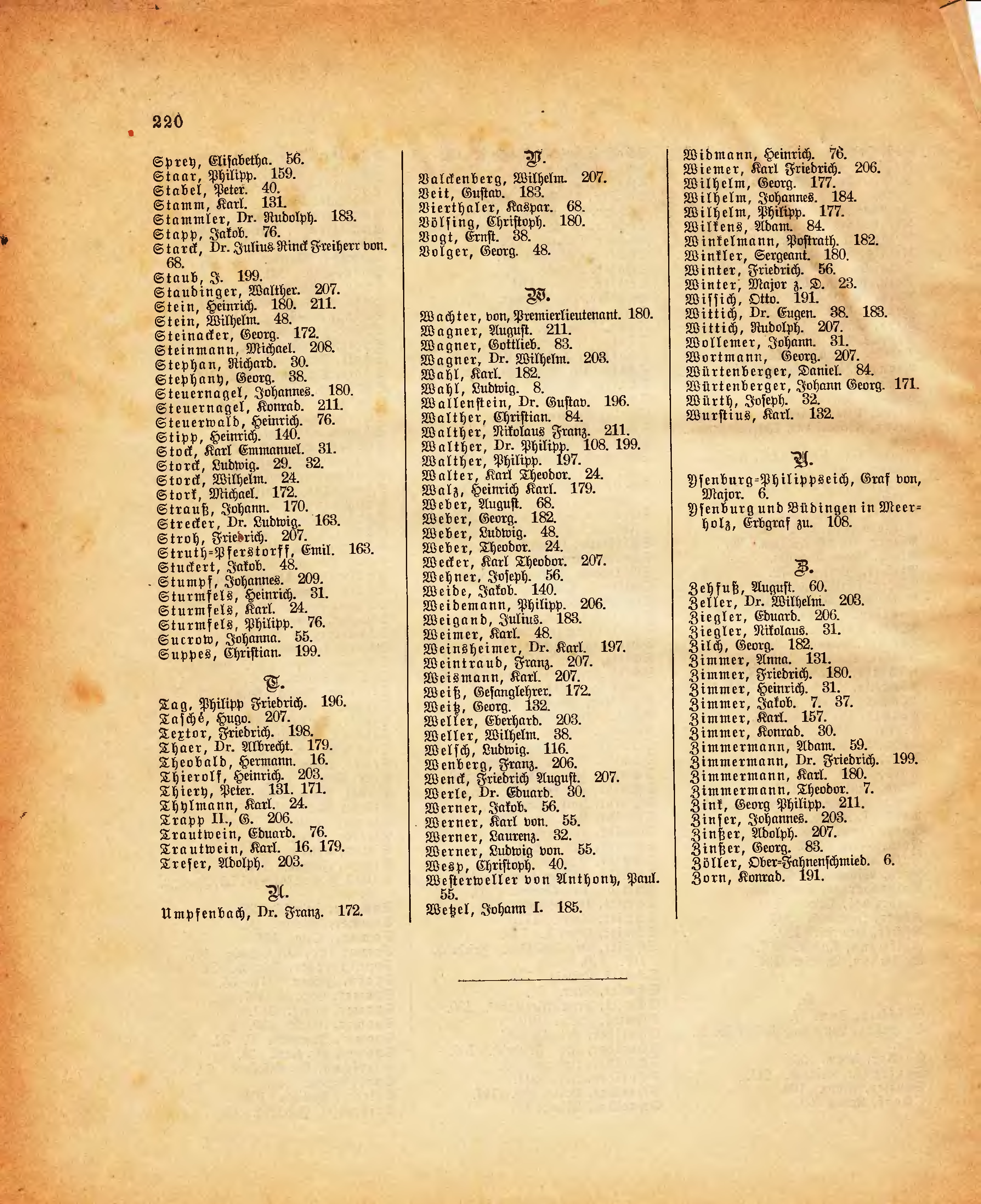 Wachter, von, Premierlieutenant. [[../B180|B180]].<br />Wagner, August. [[../B211|B211]].<br />Wagner, Gottlieb. [[../B083|B083]].<br />Wagner, Dr. Wilhelm. [[../B203|B203]].<br />Wahl, Karl. [[../B182|B182]].<br />Wahl, Ludwig. [[../B008|B008]].<br />Wallenstein, Dr. Gustav. [[../B196|B196]].<br />Walther, Christian. [[../B084|B084]].<br />Walther, Nikolaus Franz. [[../B211|B211]].<br />Walther, Dr. Philipp. [[../B108|B108]]. [[../B199|B199]].<br />Walther, Philipp. [[../B197|B197]].<br />Walter, Karl Theodor. [[../B024|B024]].<br />Walz, Heinrich Karl. [[../B179|B179]].<br />Weber, August. [[../B068|B068]].<br />Weber, Georg. [[../B182|B182]].<br />Weber, Ludwig. [[../B048|B048]].<br />Weber, Theodor. [[../B024|B024]].<br />Wecker, Karl Theodor. [[../B207|B207]].<br />Wehner, Joseph. [[../B056|B056]].<br />Weide, Jakob. [[../B140|B140]].<br />Weidemann, Philipp. [[../B206|B206]].<br />Weigand, Julius. [[../B183|B183]].<br />Weimer, Karl. [[../B048|B048]].<br />Weinsheimer, Dr. Karl. [[../B197|B197]].<br />Weintraud, Franz. [[../B207|B207]].<br />Weismann, Karl. [[../B207|B207]].<br />Weiß, Gesanglehrer. [[../B172|B172]].<br />Weitz, Georg. [[../B132|B132]].<br />Weller, Eberhard. [[../B203|B203]].<br />Weller, Wilhelm. [[../B038|B038]].<br />Welsch, Ludwig. [[../B116|B116]].<br />Wenberg, Franz. [[../B206|B206]].<br />Wenck, Friedrich August. [[../B207|B207]].<br />Werle, Dr. Eduard. [[../B030|B030]].<br />Werner, Jakob. [[../B056|B056]].<br />Werner, Karl von. [[../B055|B055]].<br />Werner, Laurenz. [[../B032|B032]].<br />Werner, Ludwig von. [[../B055|B055]].<br />Wesp, Christoph. [[../B040|B040]].<br />Westerweller von Anthony, Paul. [[../B055|B055]].<br />Wetzel, Johann I. [[../B185|B185]]. | |||