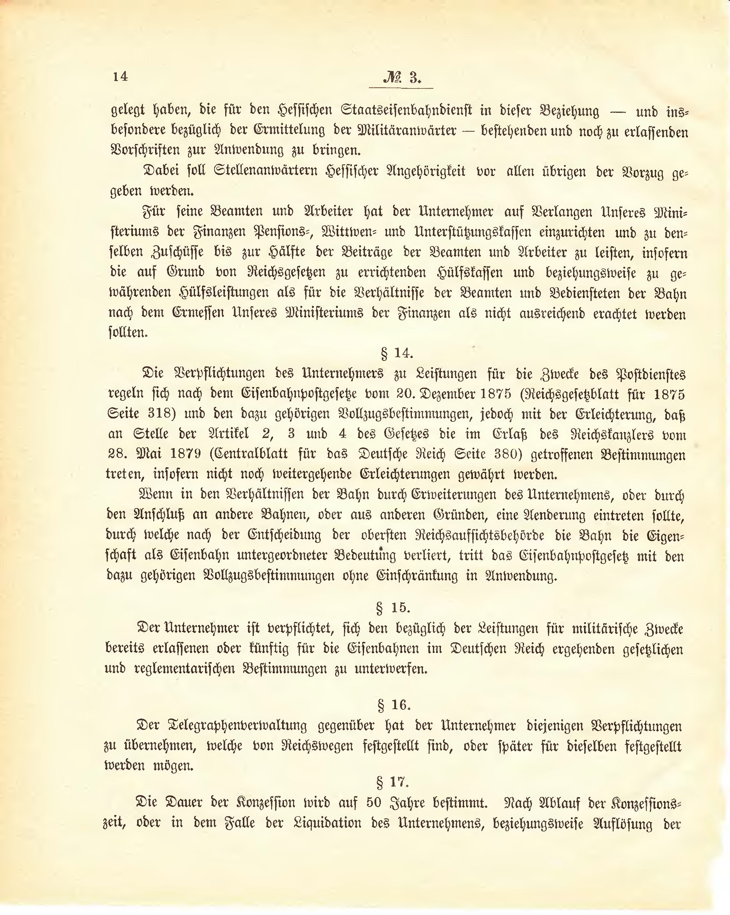 gelegt haben, die für den Hessischen Staatseisenbahndienst in dieser Beziehung - und insbesondere bezüglich der Ermittelung der Militäranwärter - bestehenden und noch zu erlassenden Vorschriften zur Anwendung zu bringen.<br />{{NE}}Dabei soll Stellenanwärtern Hessischer Angehörigkeit vor allen übrigen der Vorzug gegeben werden.<br />{{NE}}Für seine Beamten und Arbeiter hat der Unternehmer auf Verlangen Unseres Ministeriums der Finanzen Pensions-, Wittwen- und Unterstützungskassen einzurichten und zu denselben Zuschüsse bis zur Hälfte der Beiträge der Beamten und Arbeiter zu leisten, insofern die auf Grund von Reichsgesetzen zu errichtenden Hülfskassen und beziehungsweise zu gewährenden Hülfsleistungen als für die Verhältnisse der Beamten und Bediensteten der Bahn nach dem Ermessen Unseres Ministeriums der Finanzen als nicht ausreichend erachtet werden sollten. | |||
