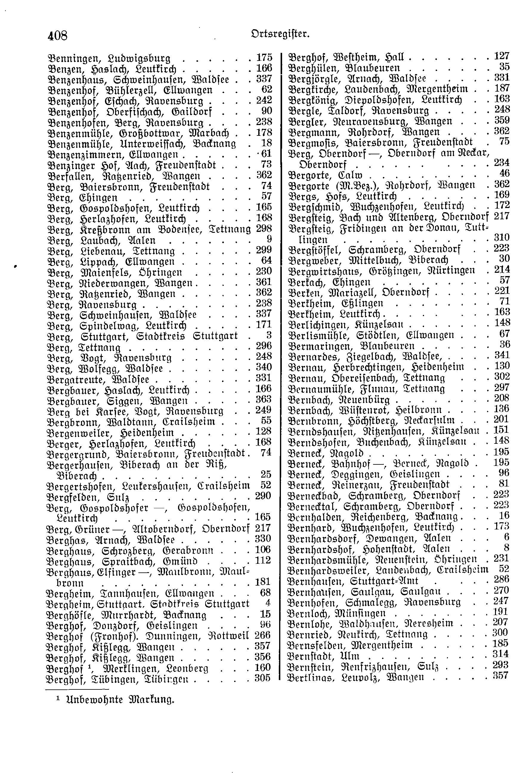 | Bergbauer, Haslach, Leutkirch | 166 | Bernaumühle, Flunau, Tettnang | 297 |