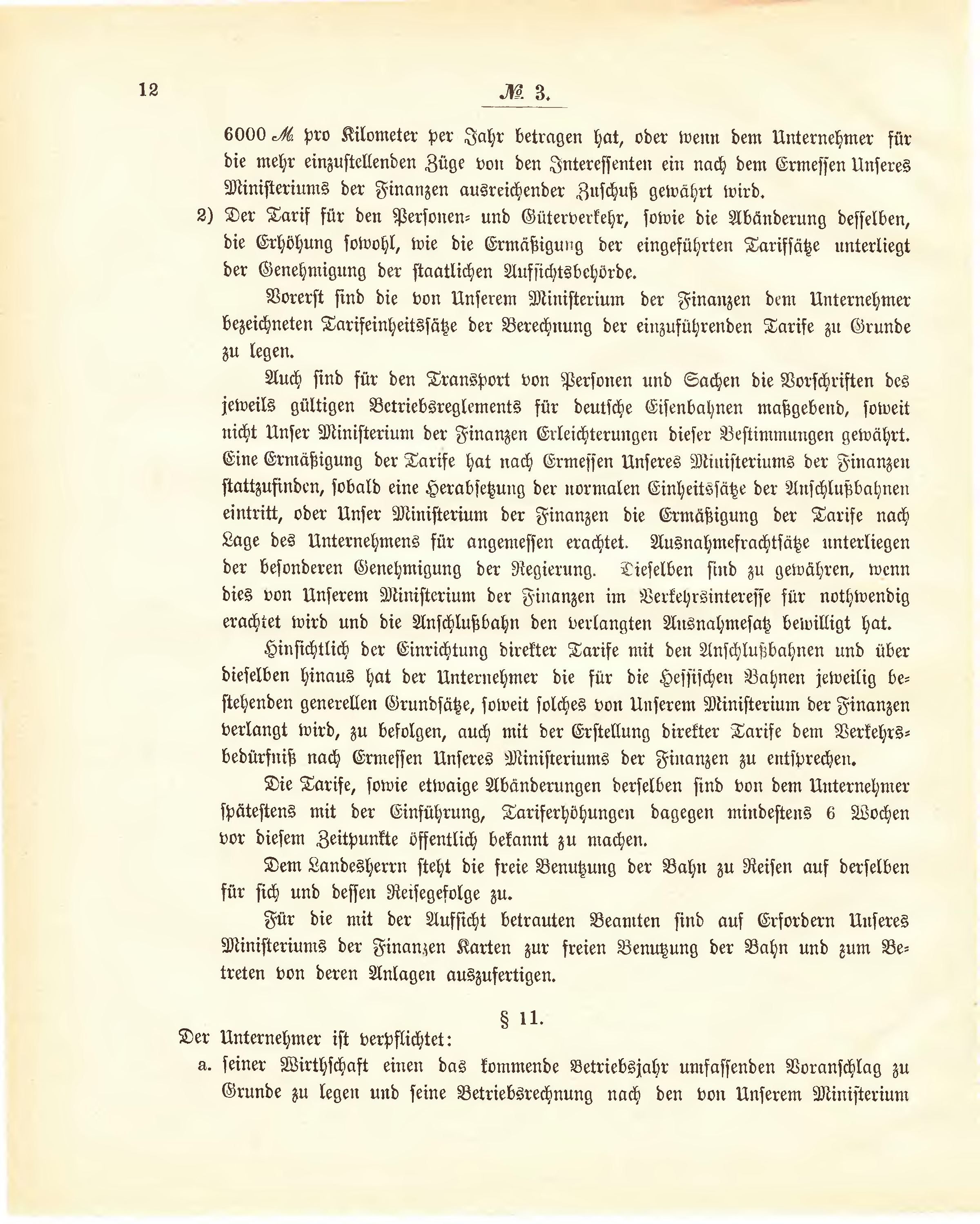 | Die Tarife, sowie etwaige Abänderungen derselben sind von dem Unternehmer spätestens mit der Einführung, Tariferhöhungen dagegen mindestens 6 Wochen vor diesem Zeitpunkte öffentlich bekannt zu machen. Dem Landesherrn steht die freie Benutzung der Bahn zu Reisen auf derselben für sich und dessen Reisegefolge zu. Für die mit der Aussicht betrauten Beamten sind auf Erfordern Unseres Ministeriums der Finanzen Karten zur freien Benutzung der Bahn und zum Betreten von deren Anlagen auszufertigen. | ||