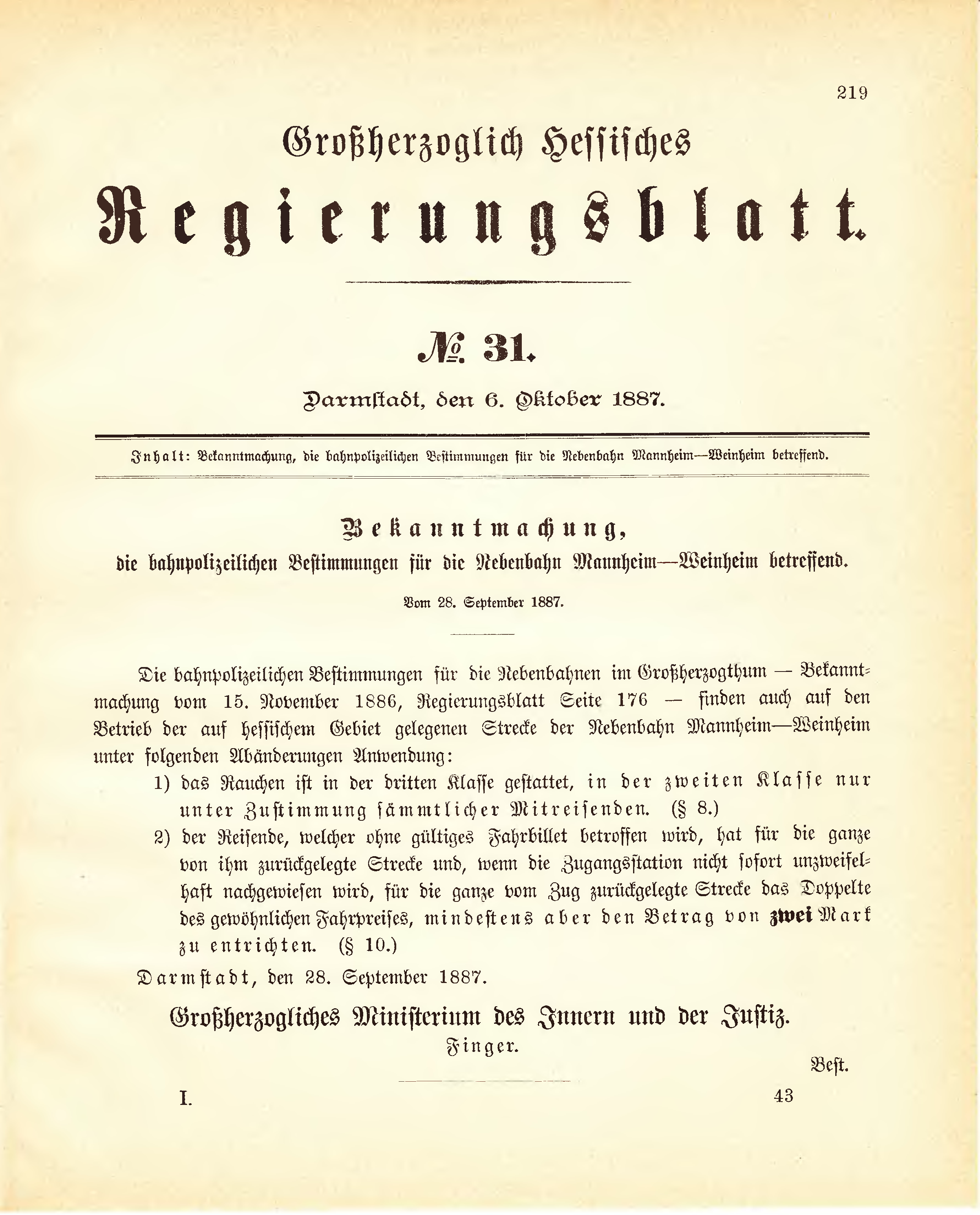 Die bahnpolizeilichen Bestimmungen für die Nebenbahnen im Großherzogthum - Bekanntmachung vom 15. November 1886, Regierungsblatt Seite 176 - finden auch auf den Betrieb der auf hessischem Gebiet gelegenen Strecke der Nebenbahn Mannheim-Weinheim unter folgenden Abänderungen Anwendung:
